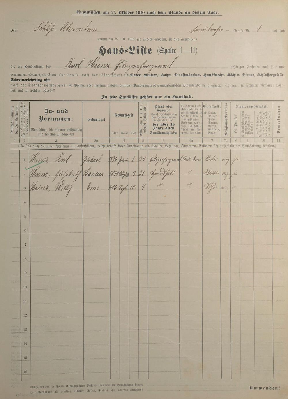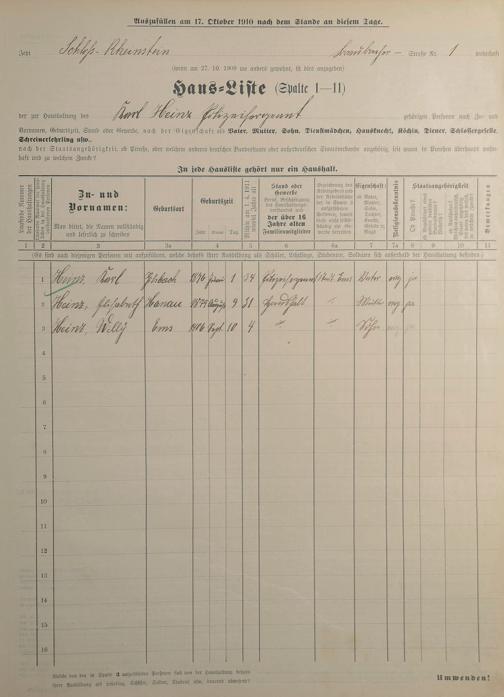 Personenstandsaufnahme zur Klassensteuerrolle für 1910