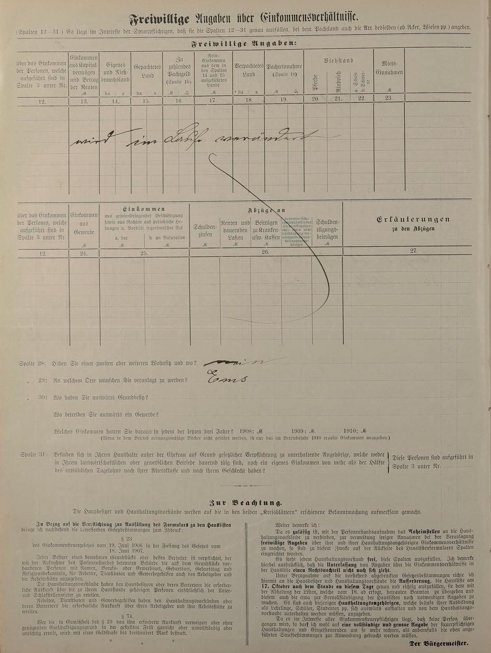 Personenstandsaufnahme zur Klassensteuerrolle für 1910