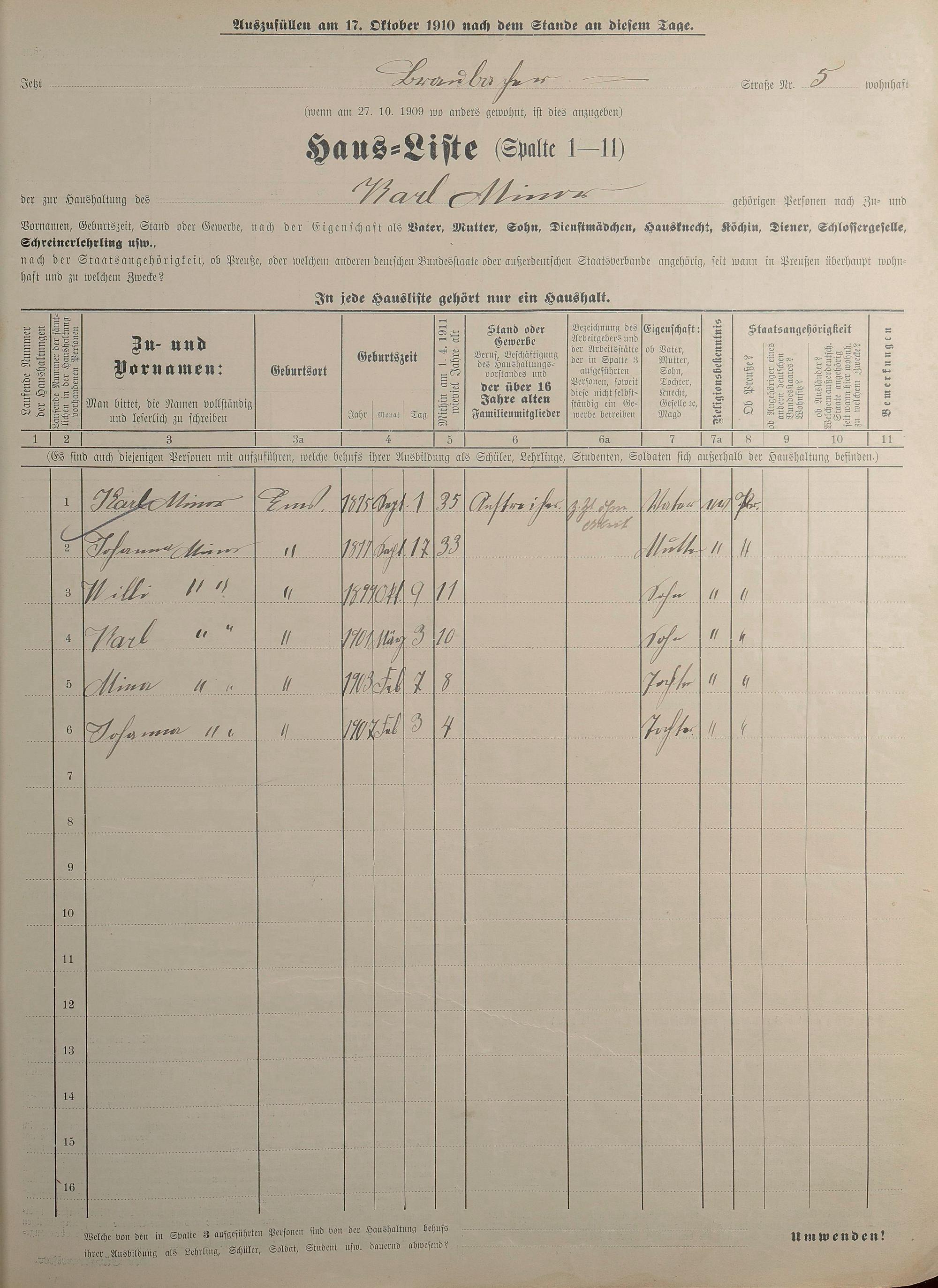 Personenstandsaufnahme zur Klassensteuerrolle für 1910