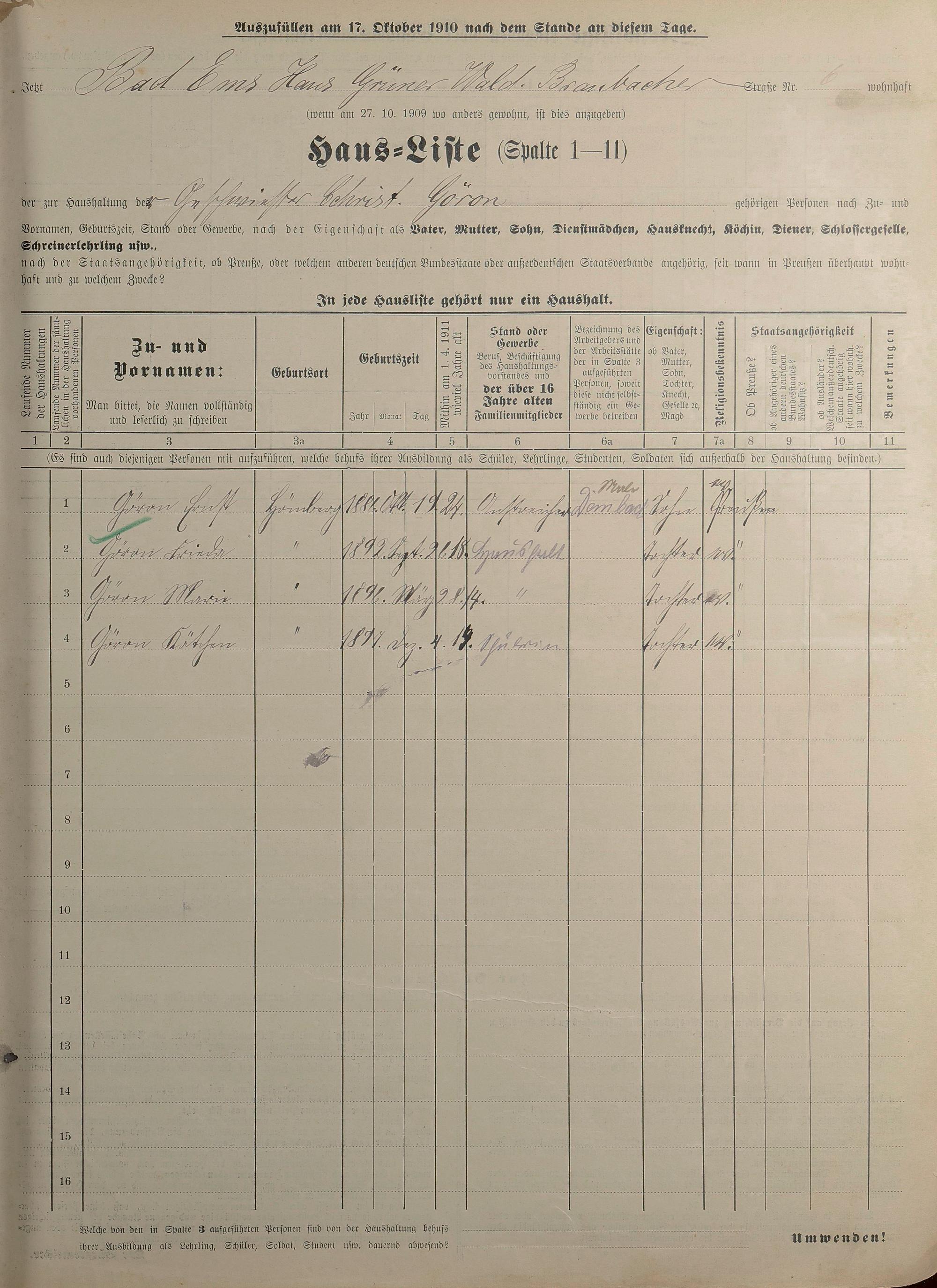 Personenstandsaufnahme zur Klassensteuerrolle für 1910
