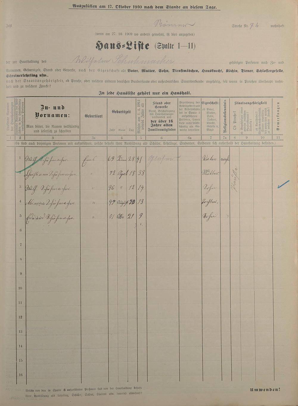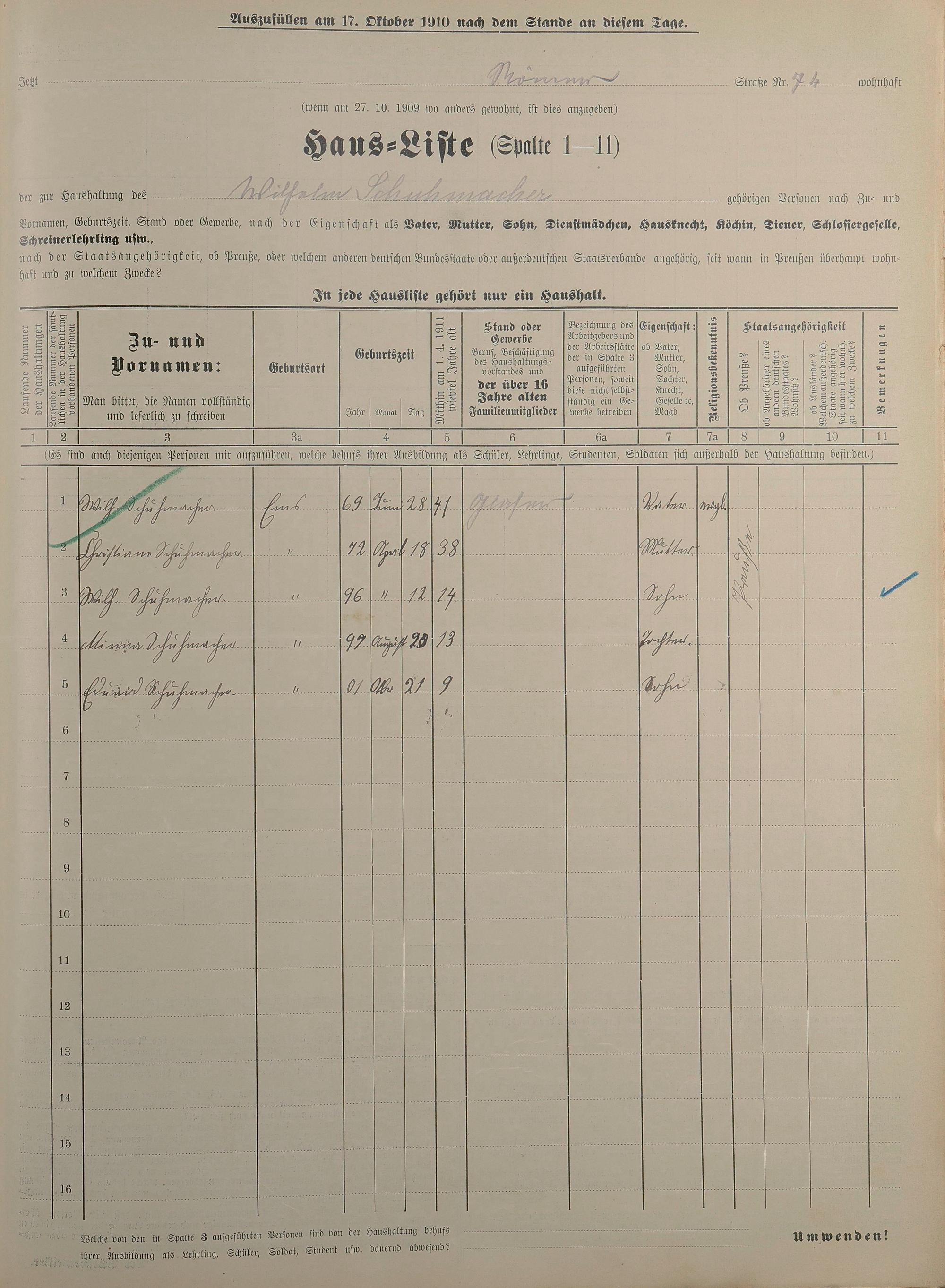 Personenstandsaufnahme zur Klassensteuerrolle für 1910