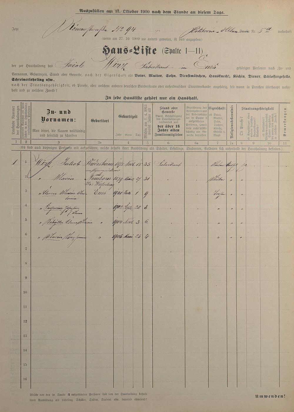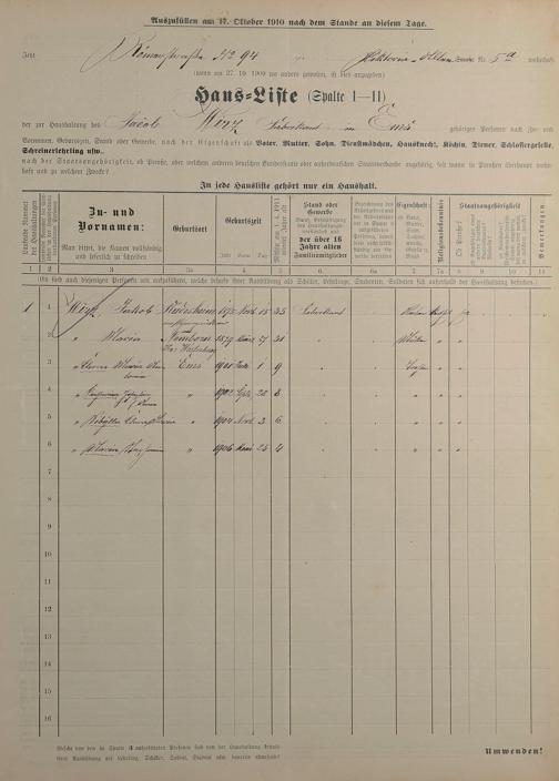 Personenstandsaufnahme zur Klassensteuerrolle für 1910