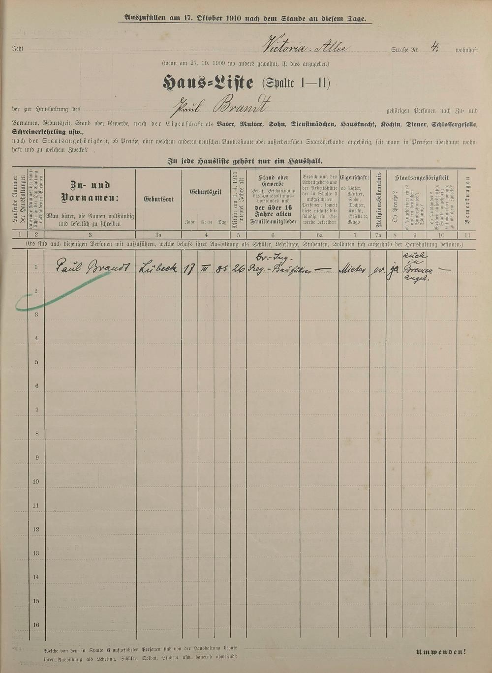 Personenstandsaufnahme zur Klassensteuerrolle für 1910