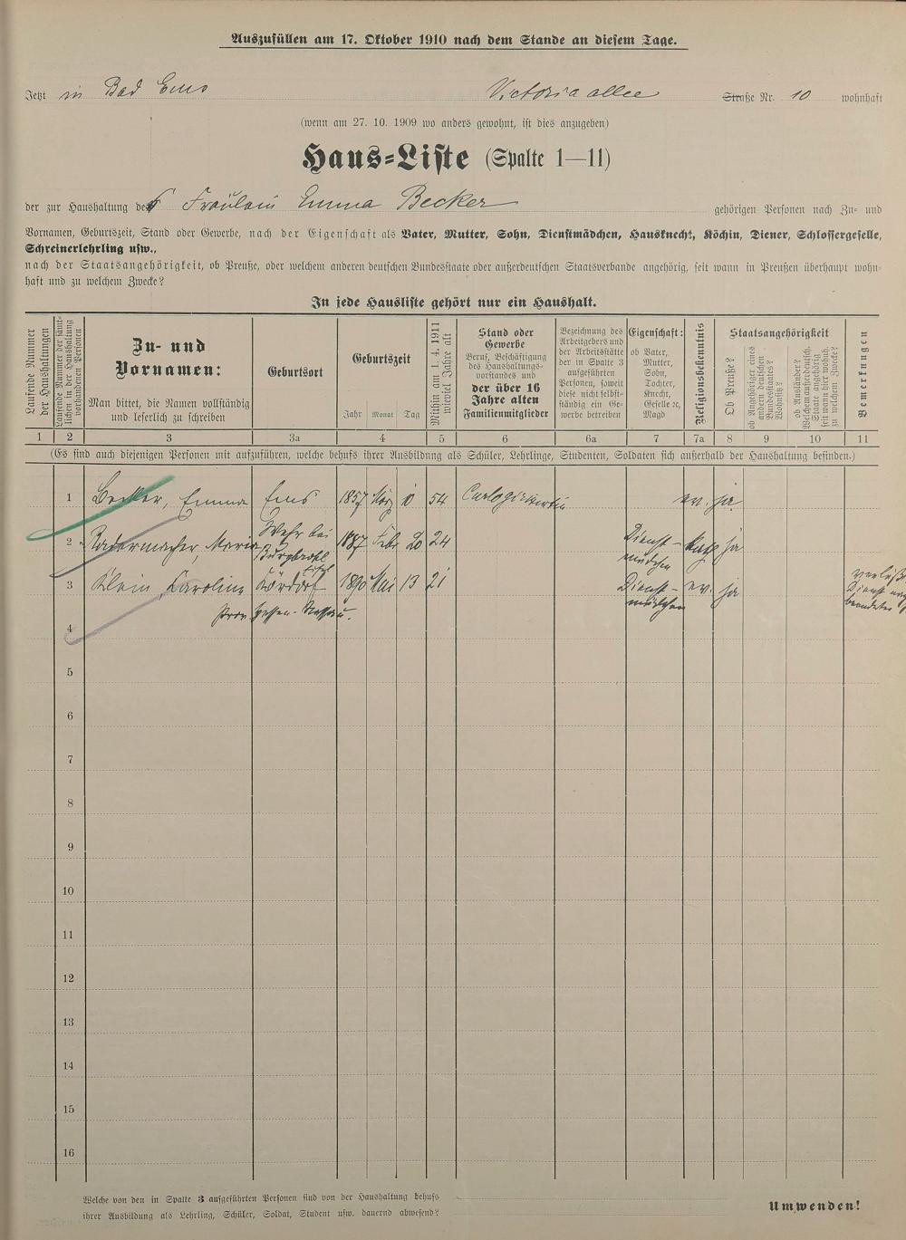 Personenstandsaufnahme zur Klassensteuerrolle für 1910