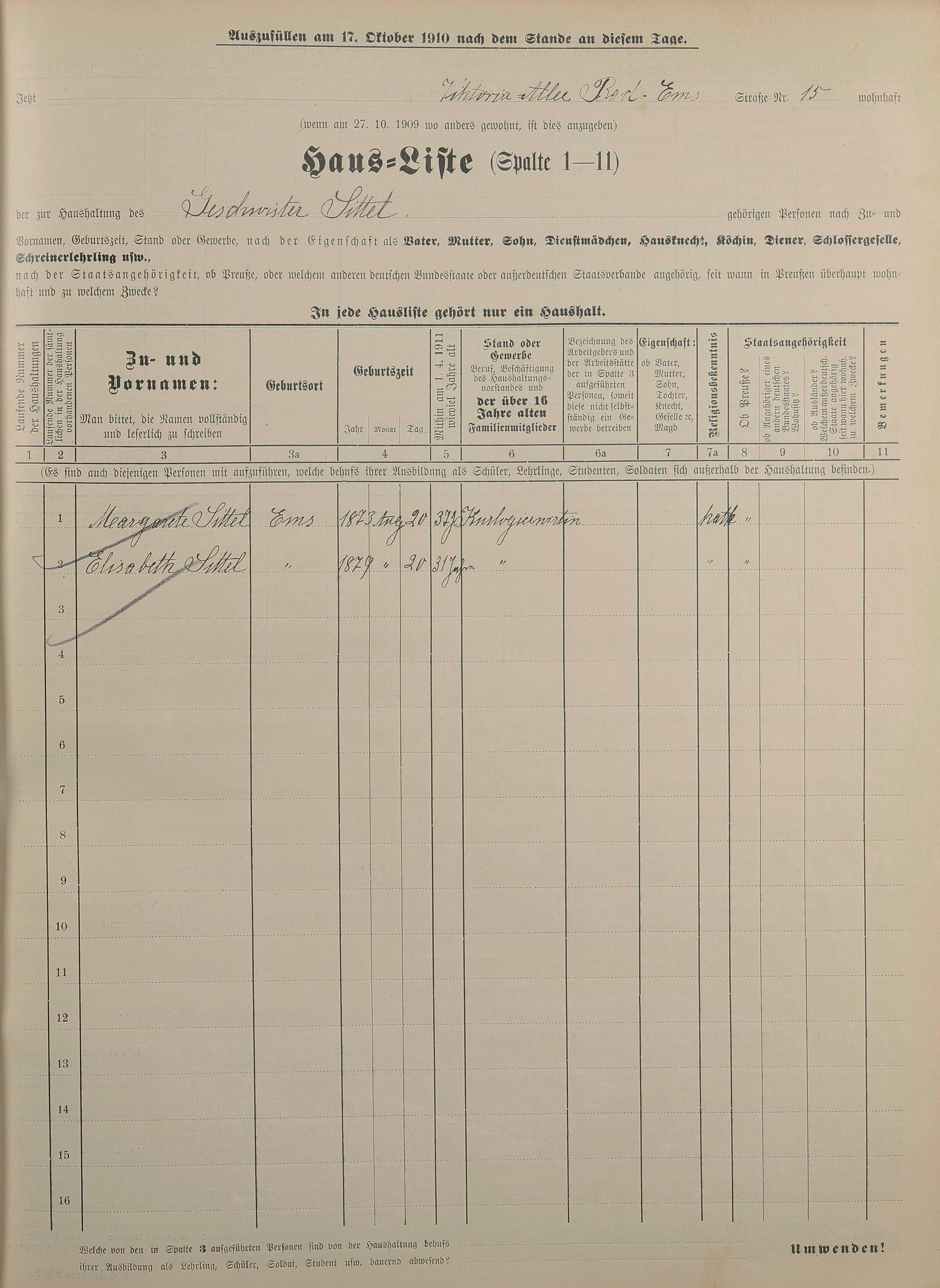Personenstandsaufnahme zur Klassensteuerrolle für 1910