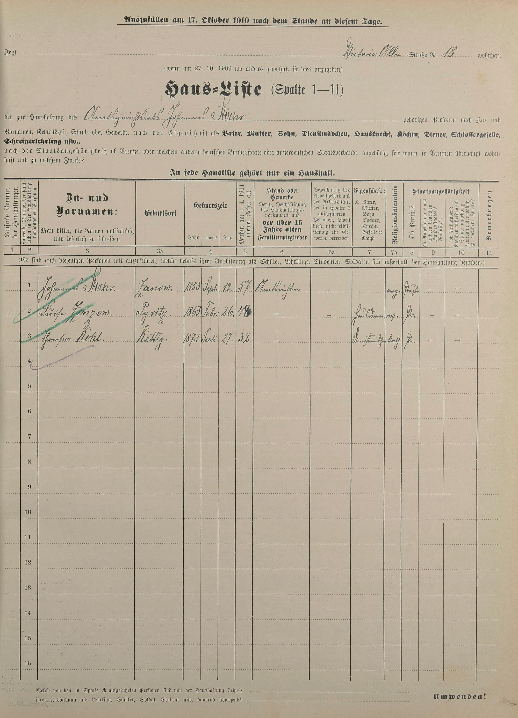 Personenstandsaufnahme zur Klassensteuerrolle für 1910