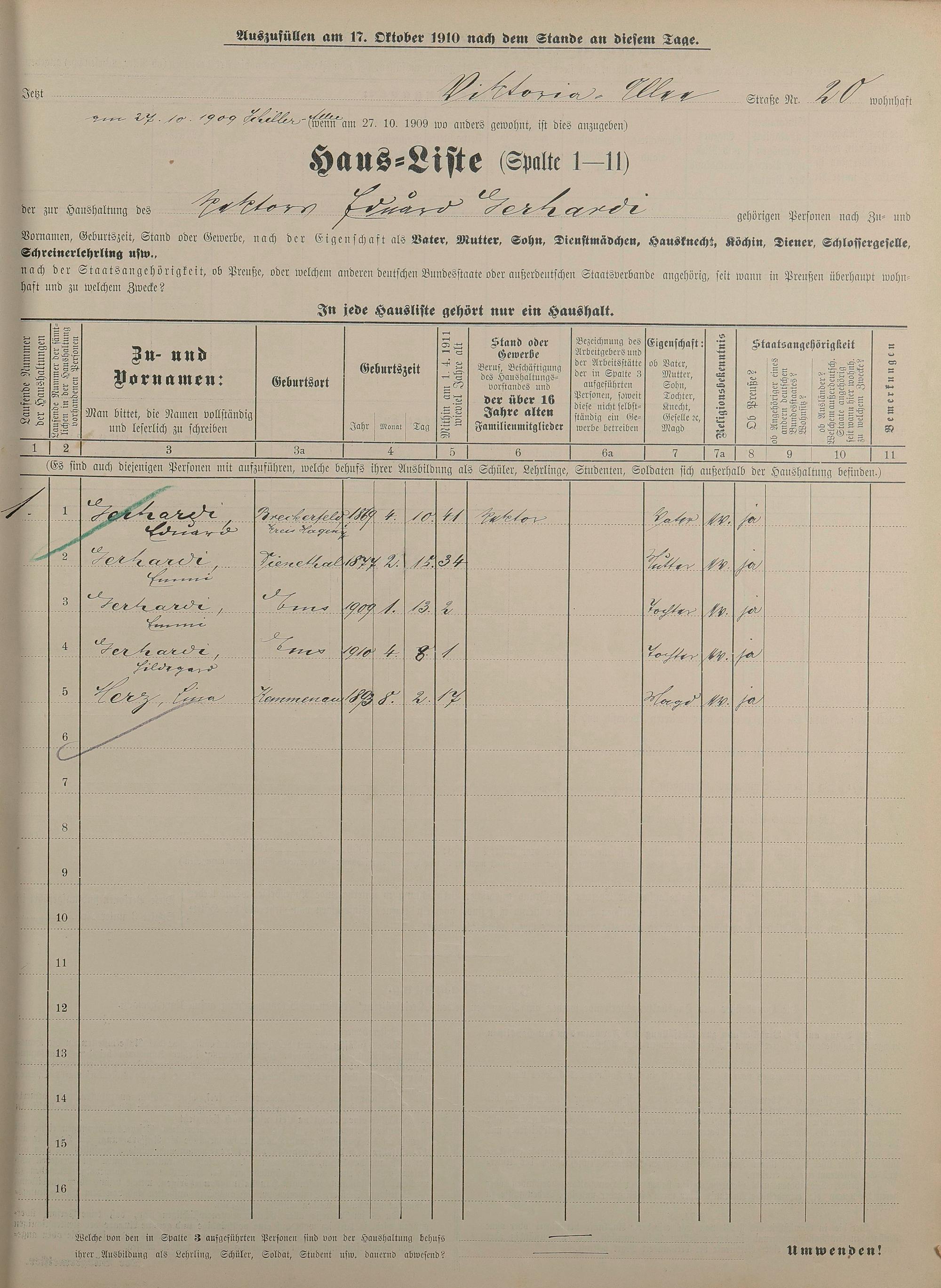 Personenstandsaufnahme zur Klassensteuerrolle für 1910