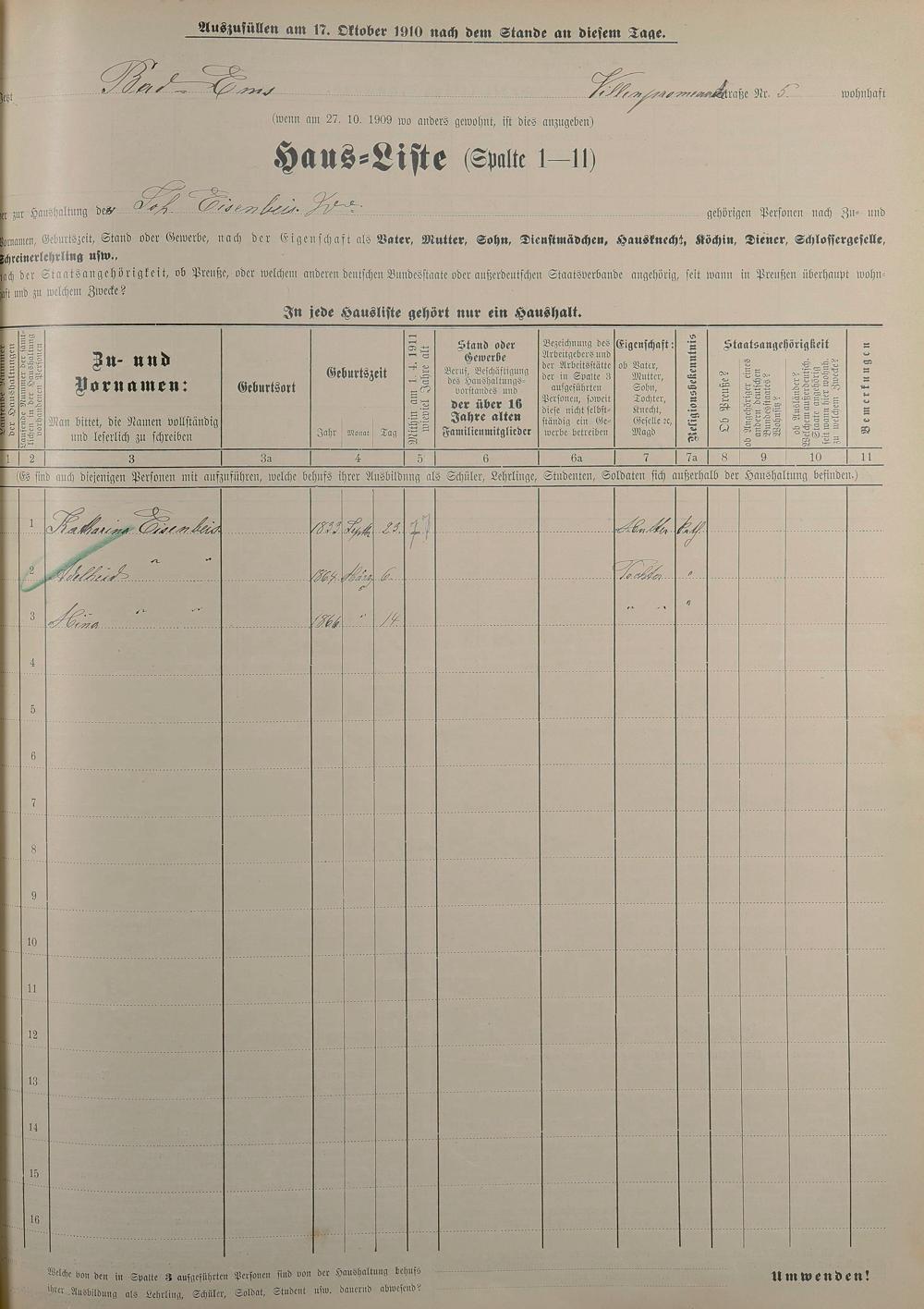 Personenstandsaufnahme zur Klassensteuerrolle für 1910