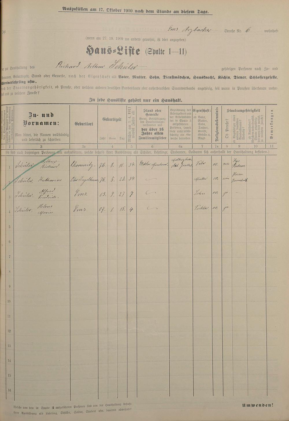 Personenstandsaufnahme zur Klassensteuerrolle für 1910