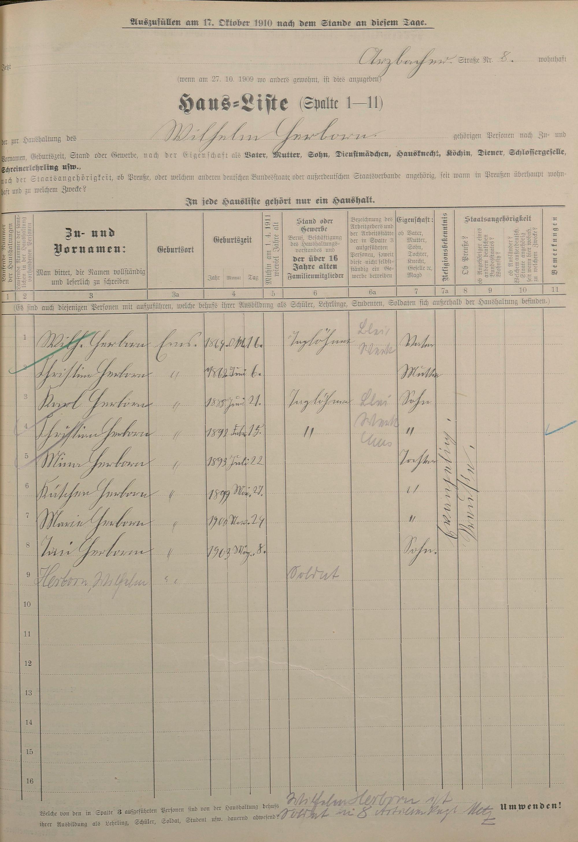 Personenstandsaufnahme zur Klassensteuerrolle für 1910