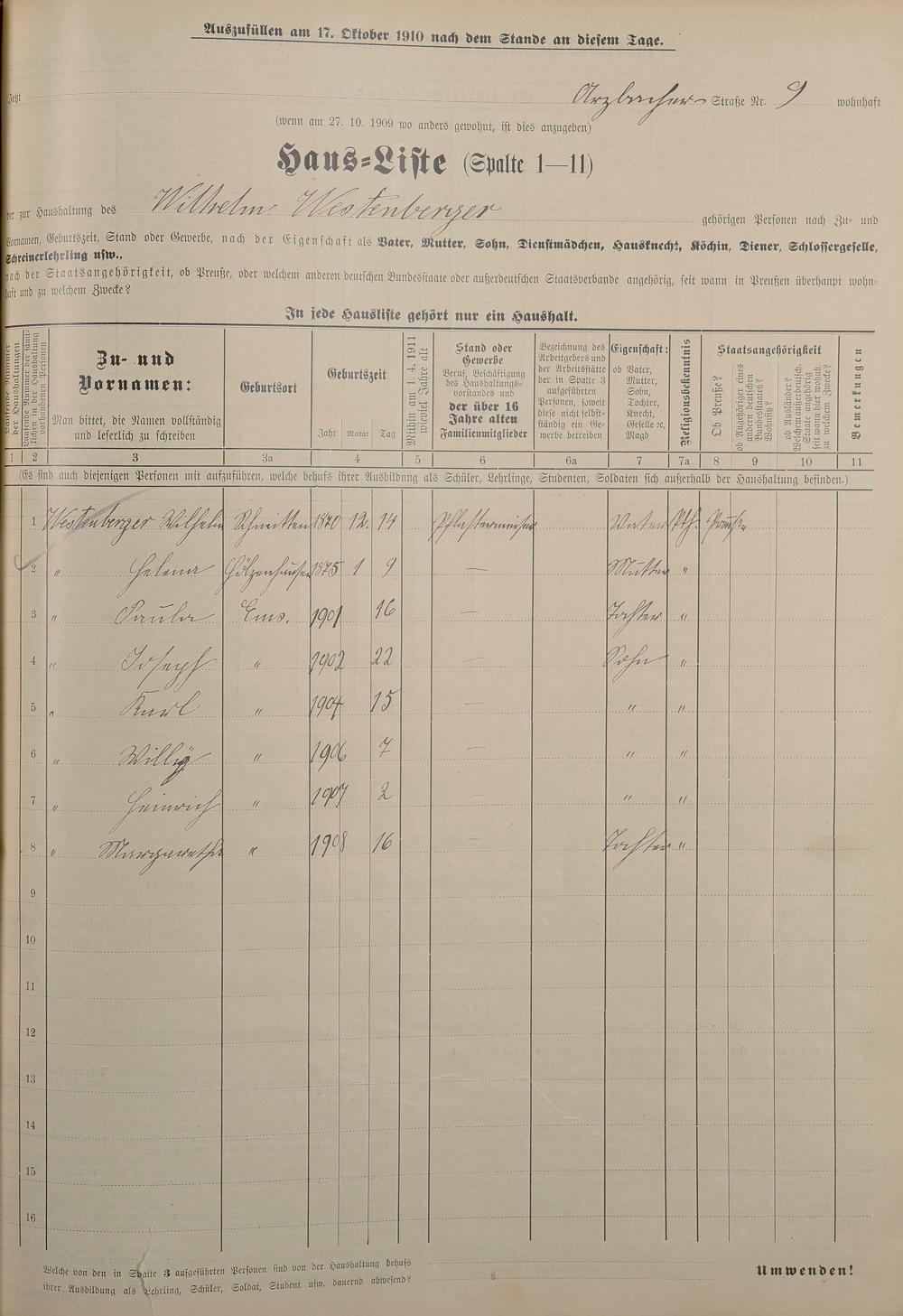 Personenstandsaufnahme zur Klassensteuerrolle für 1910