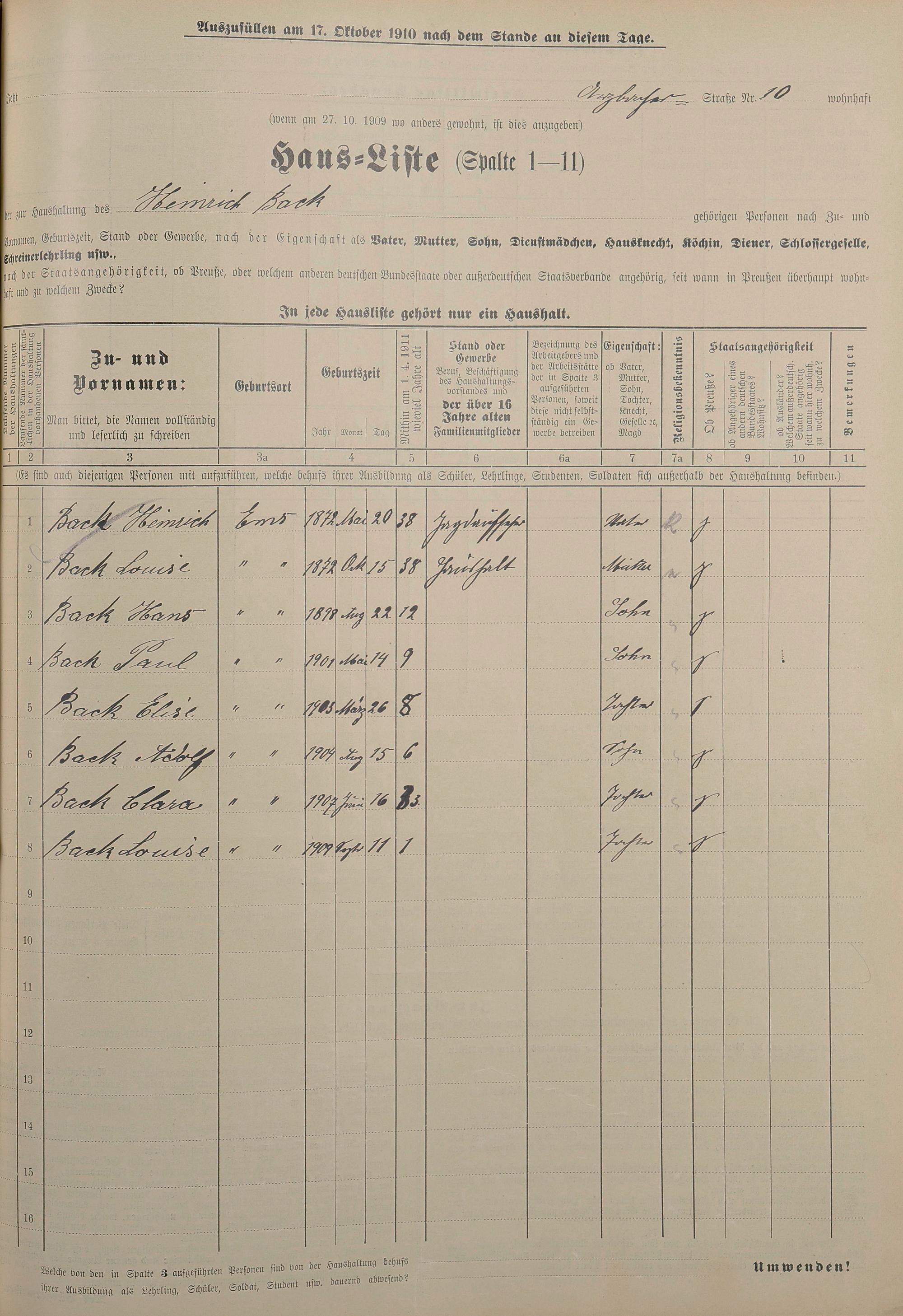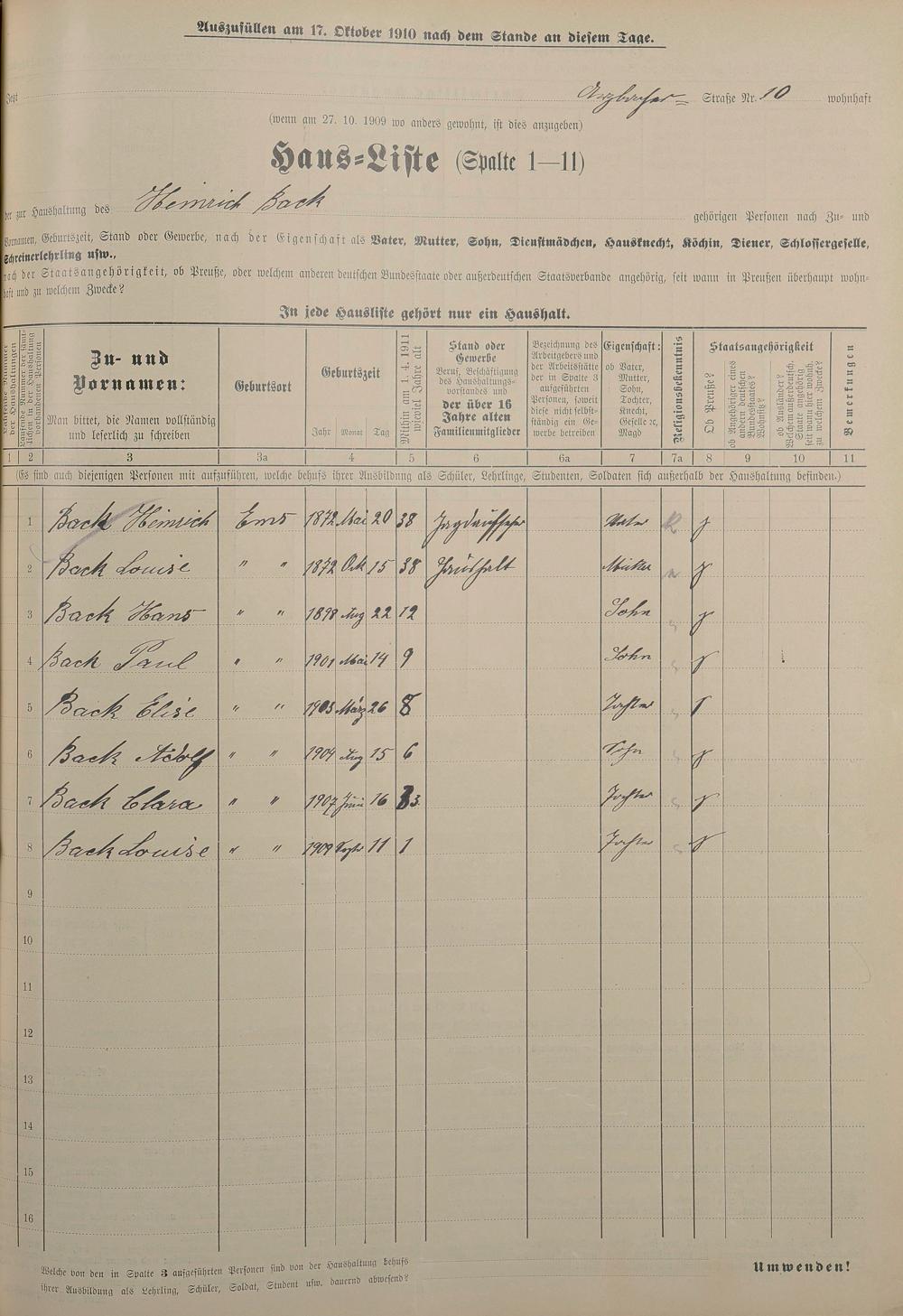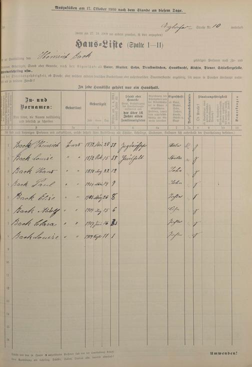 Personenstandsaufnahme zur Klassensteuerrolle für 1910