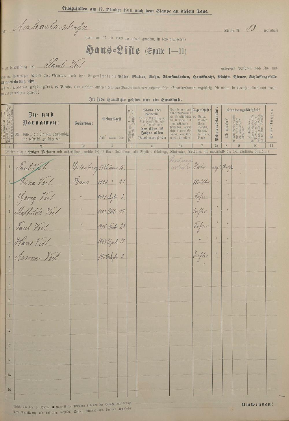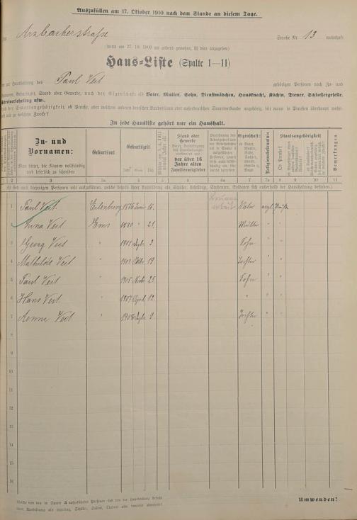 Personenstandsaufnahme zur Klassensteuerrolle für 1910