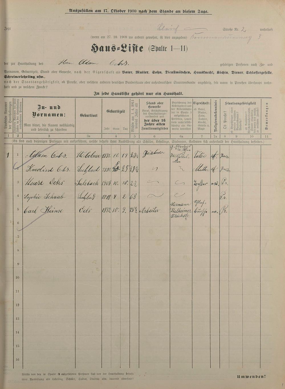 Personenstandsaufnahme zur Klassensteuerrolle für 1910