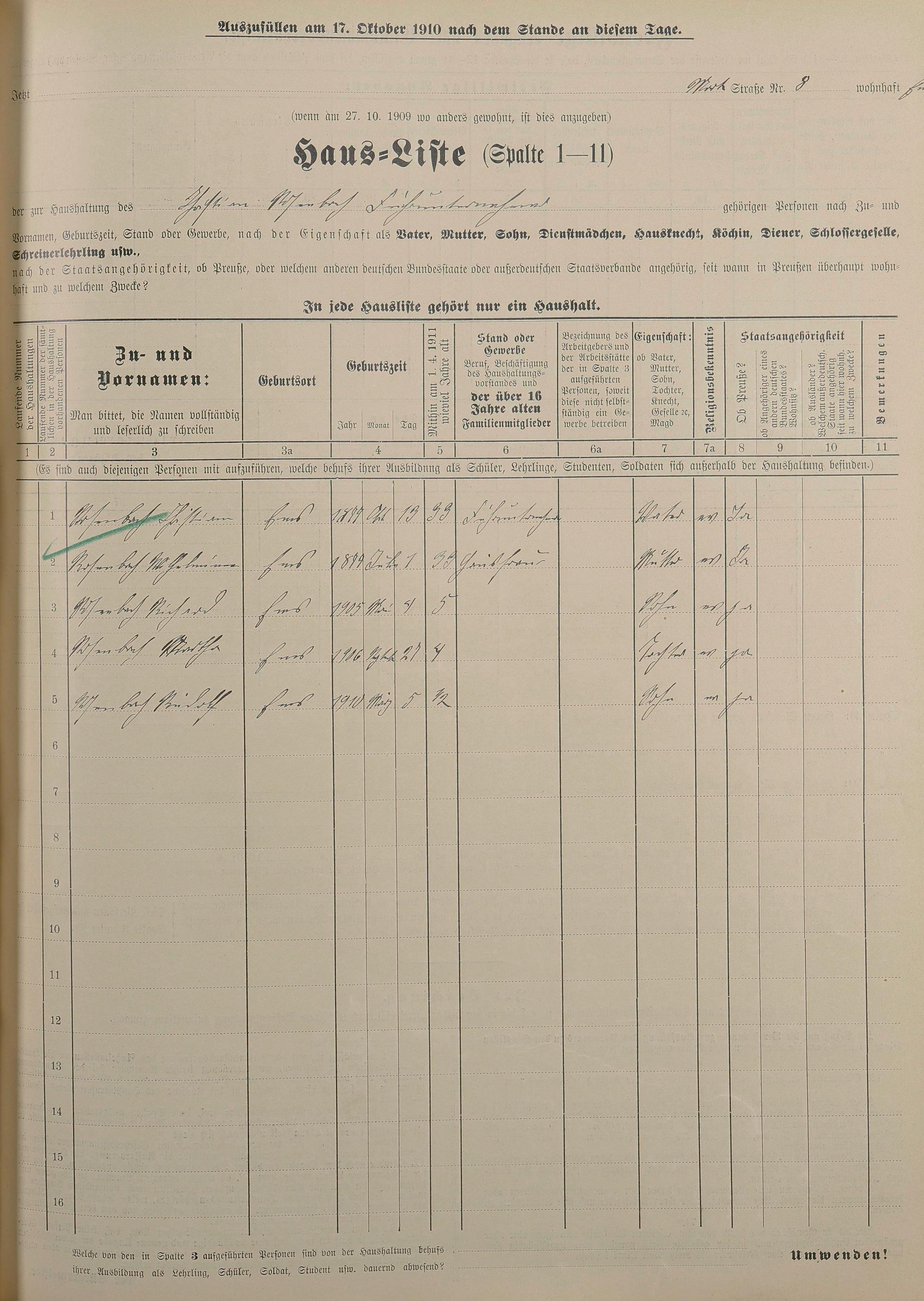 Personenstandsaufnahme zur Klassensteuerrolle für 1910