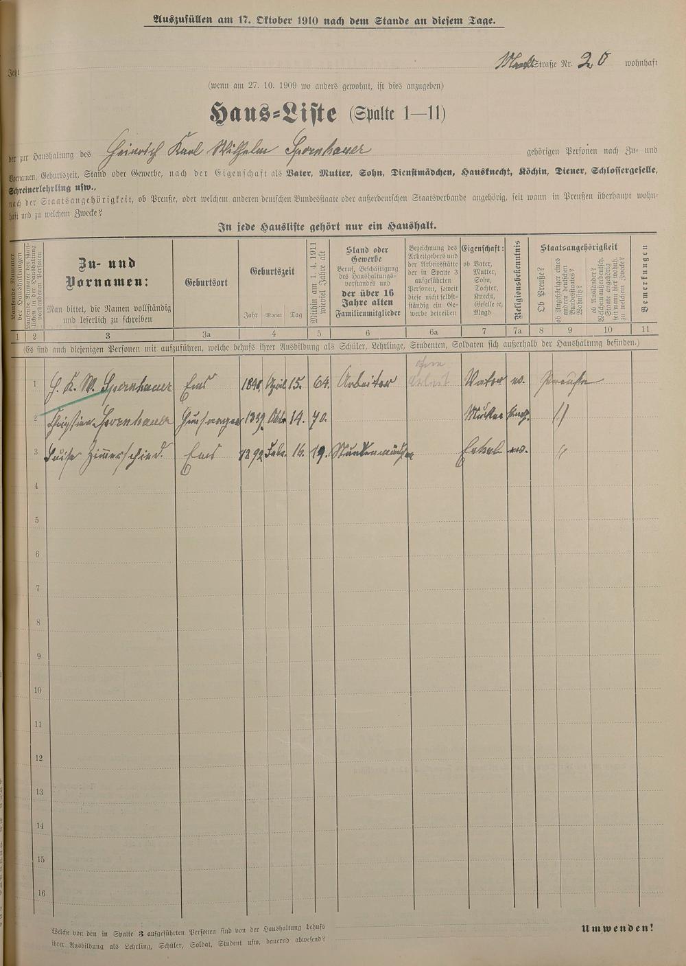 Personenstandsaufnahme zur Klassensteuerrolle für 1910