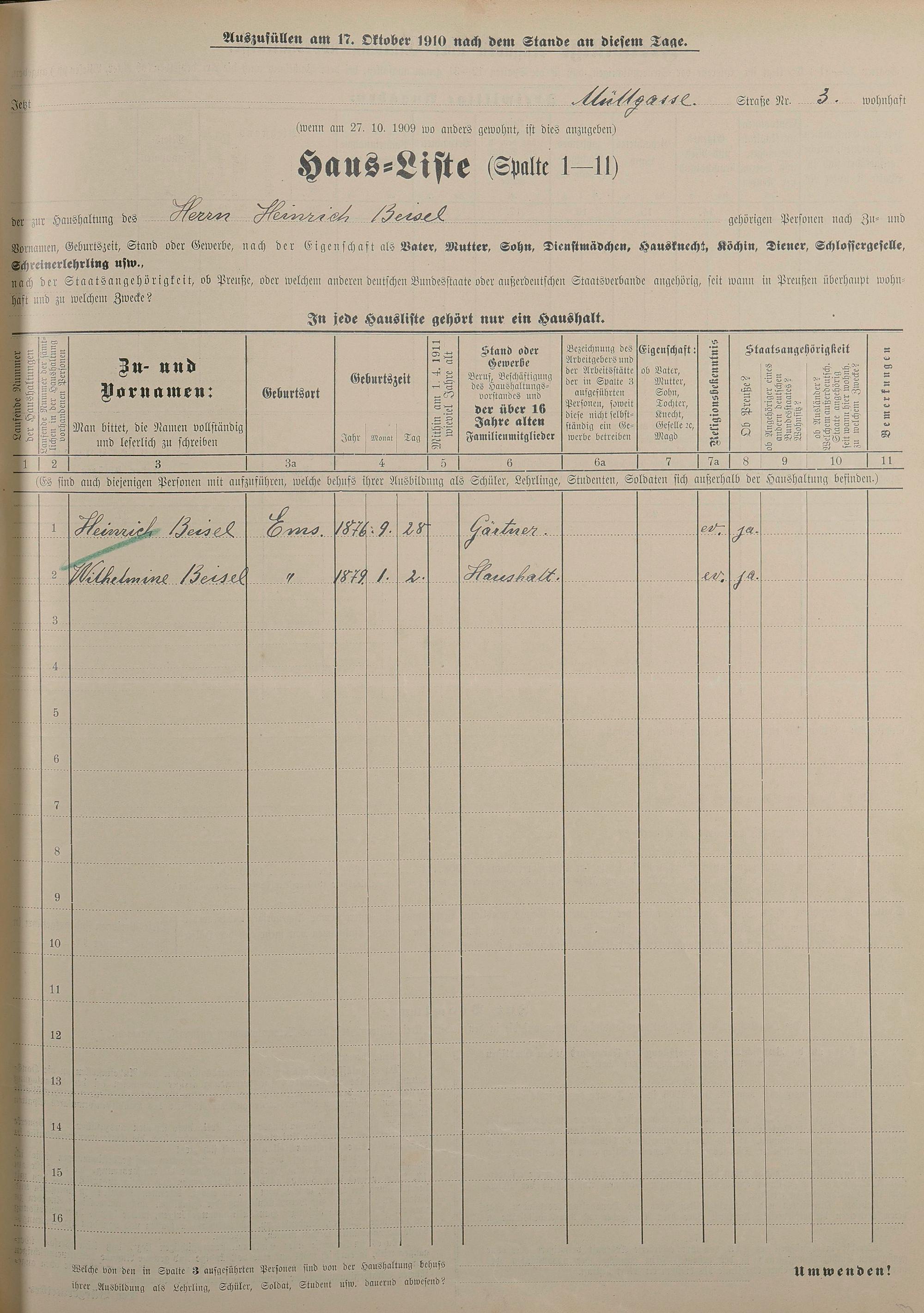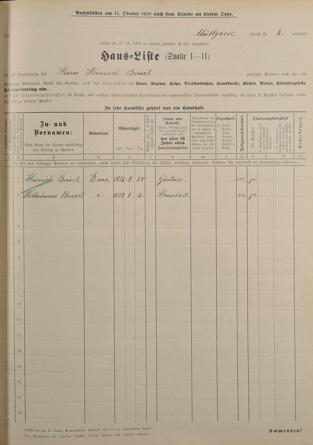 Personenstandsaufnahme zur Klassensteuerrolle für 1910