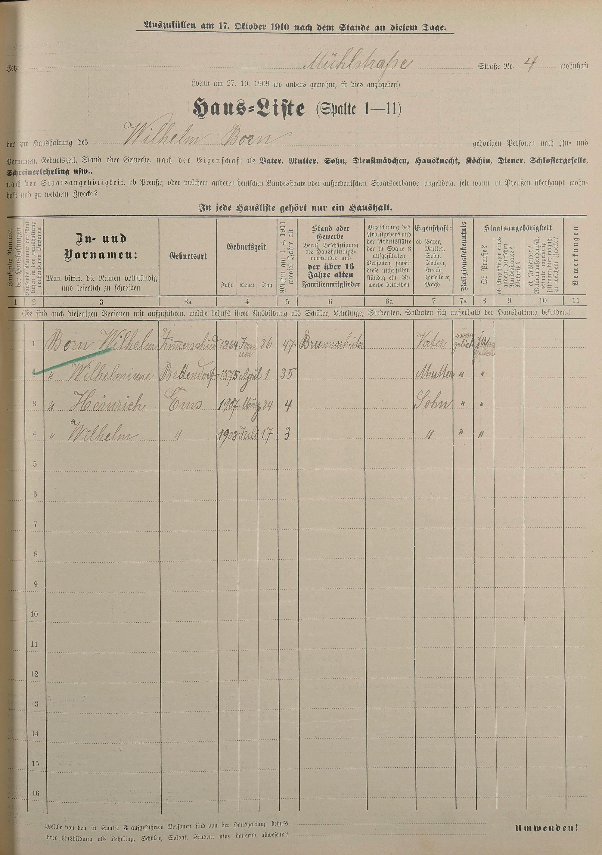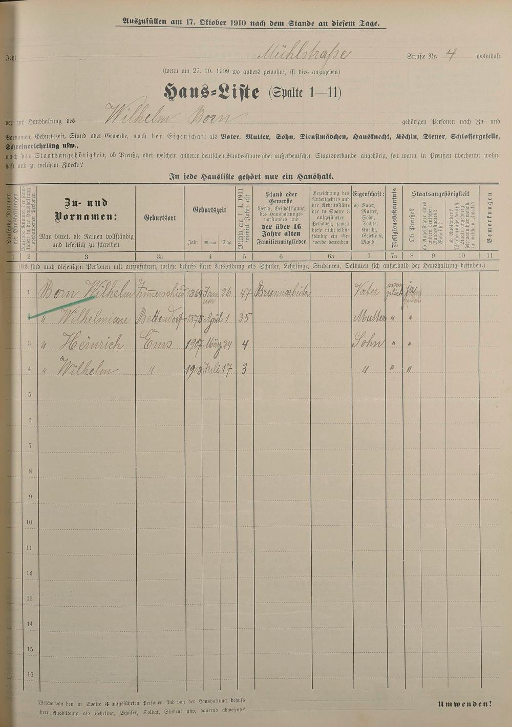 Personenstandsaufnahme zur Klassensteuerrolle für 1910