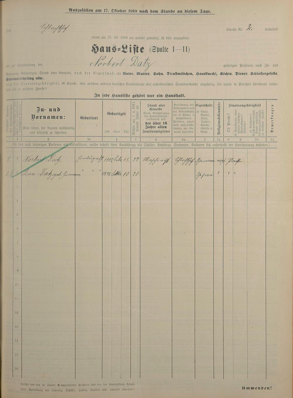 Personenstandsaufnahme zur Klassensteuerrolle für 1910