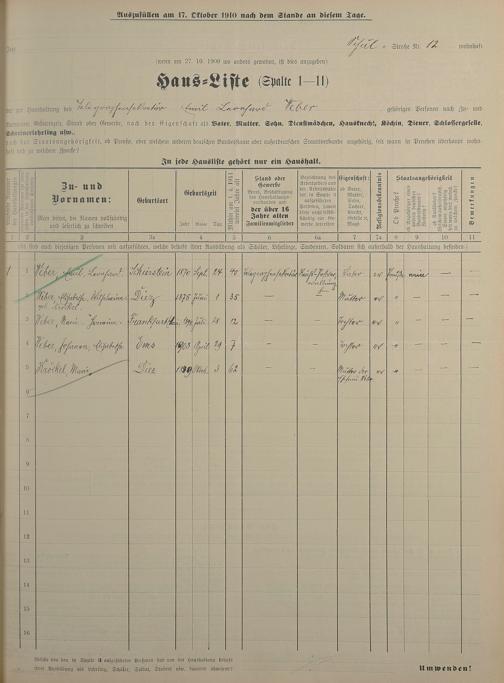 Personenstandsaufnahme zur Klassensteuerrolle für 1910