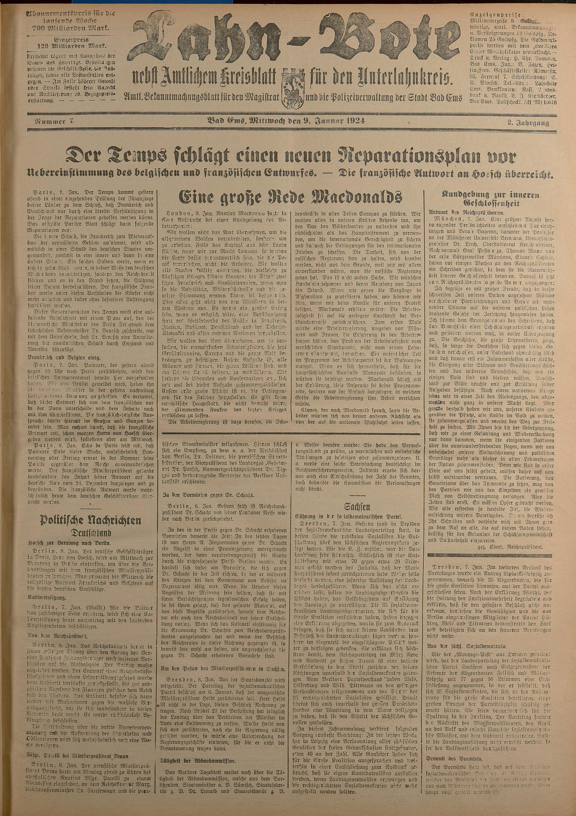 1924: Lahnbote bis 4. Apr. 1924/Emser Zeitung ab 5. Apr. 1924 - Nr. 10, 37 und 71...