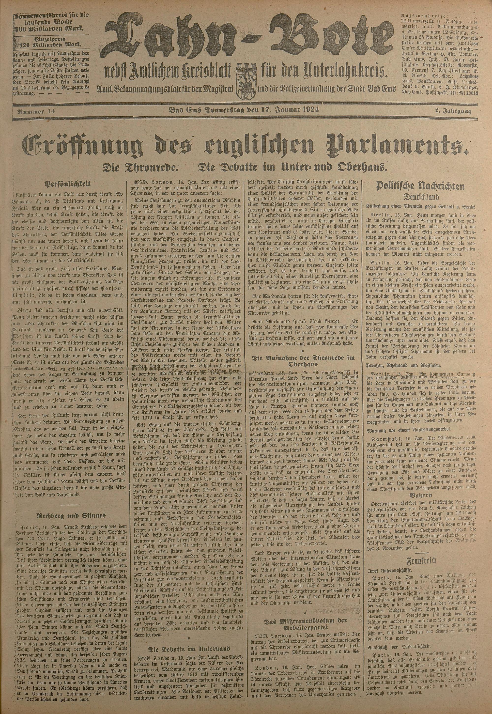 1924: Lahnbote bis 4. Apr. 1924/Emser Zeitung ab 5. Apr. 1924 - Nr. 10, 37 und 71...