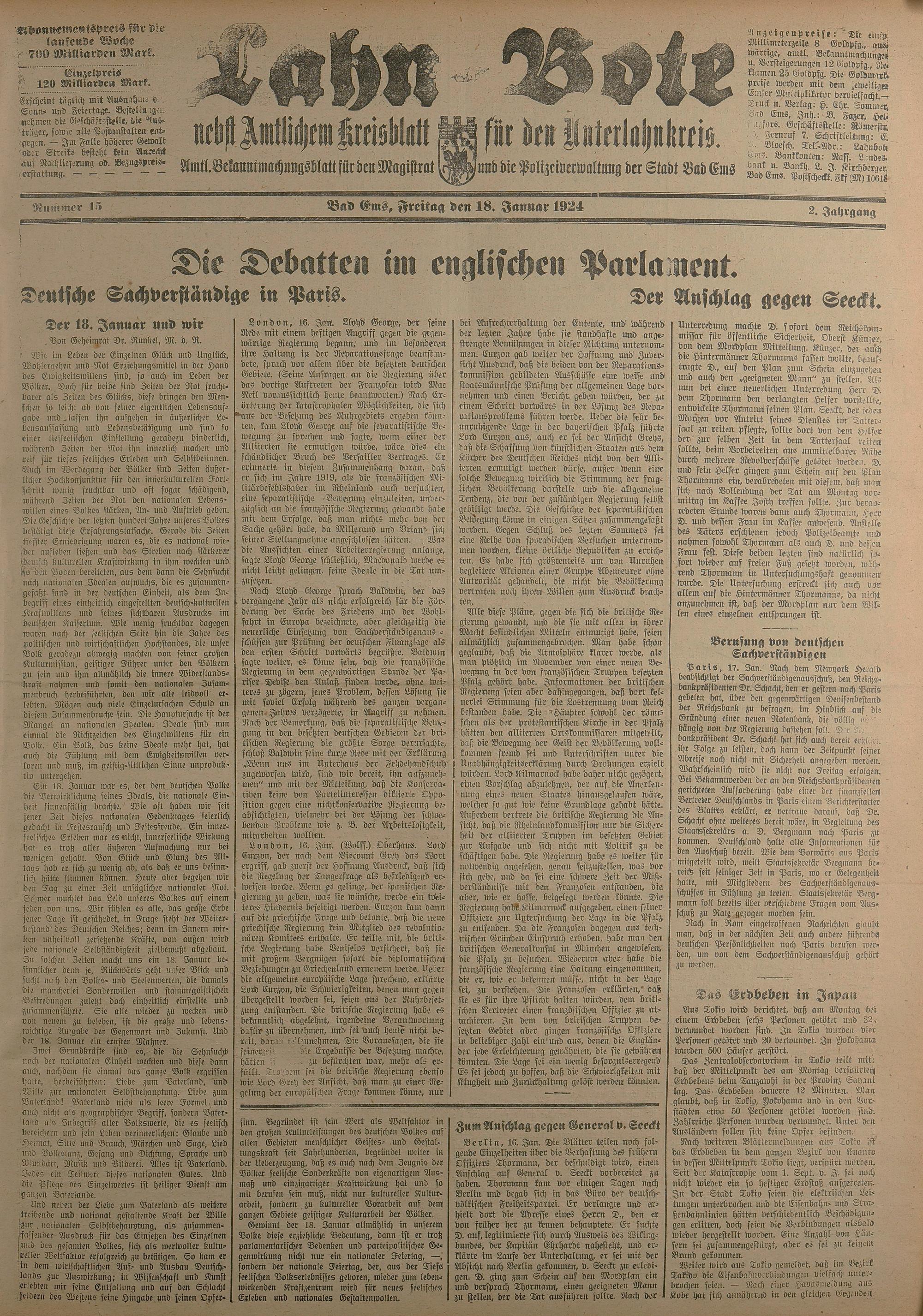 1924: Lahnbote bis 4. Apr. 1924/Emser Zeitung ab 5. Apr. 1924 - Nr. 10, 37 und 71...