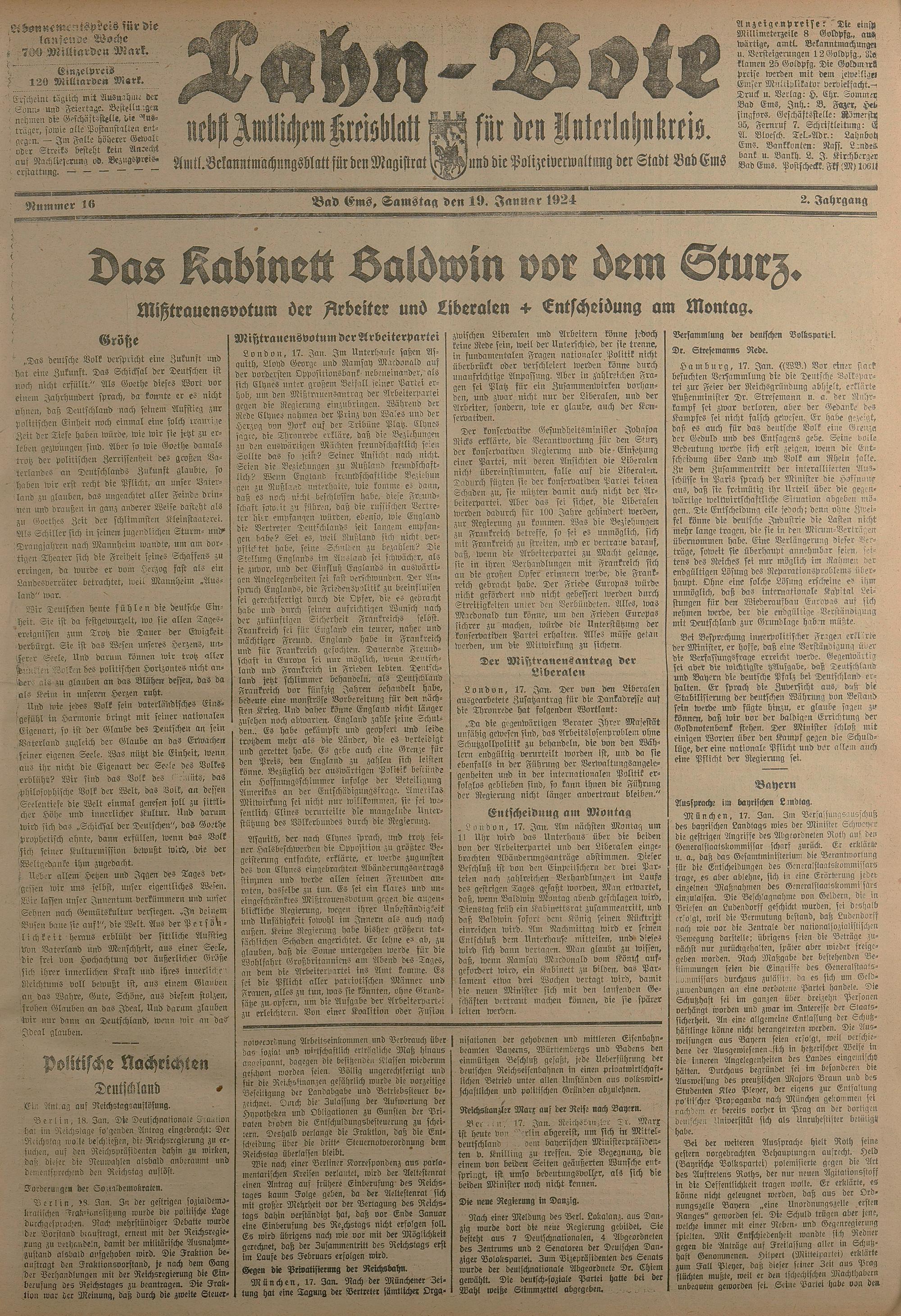 1924: Lahnbote bis 4. Apr. 1924/Emser Zeitung ab 5. Apr. 1924 - Nr. 10, 37 und 71...