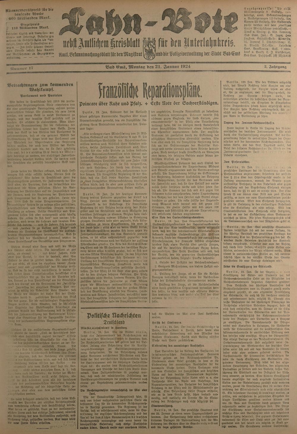 1924: Lahnbote bis 4. Apr. 1924/Emser Zeitung ab 5. Apr. 1924 - Nr. 10, 37 und 71...