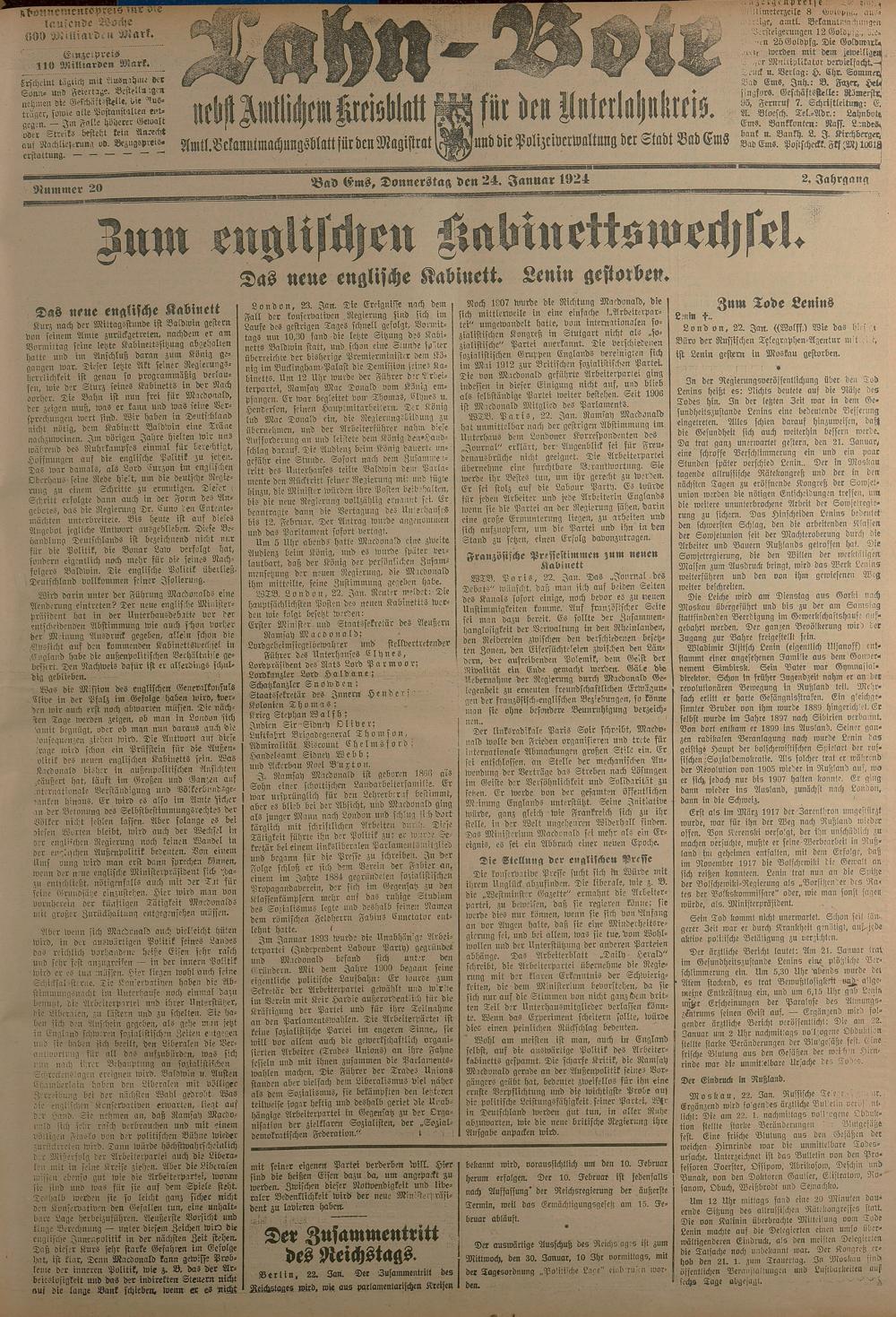 1924: Lahnbote bis 4. Apr. 1924/Emser Zeitung ab 5. Apr. 1924 - Nr. 10, 37 und 71...