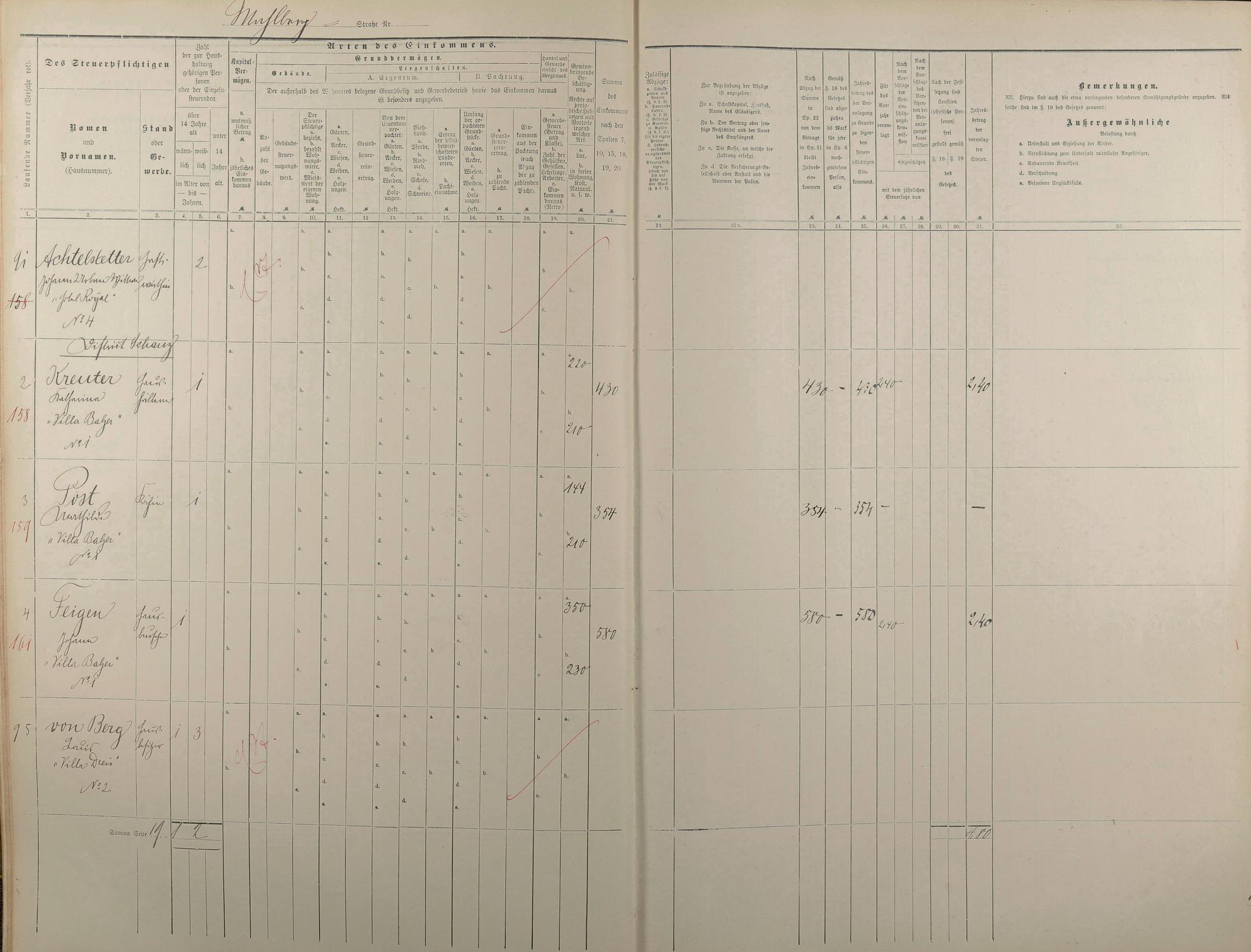 Personenverzeichnis und Einkommenssteuerliste 1893 nach Straßen