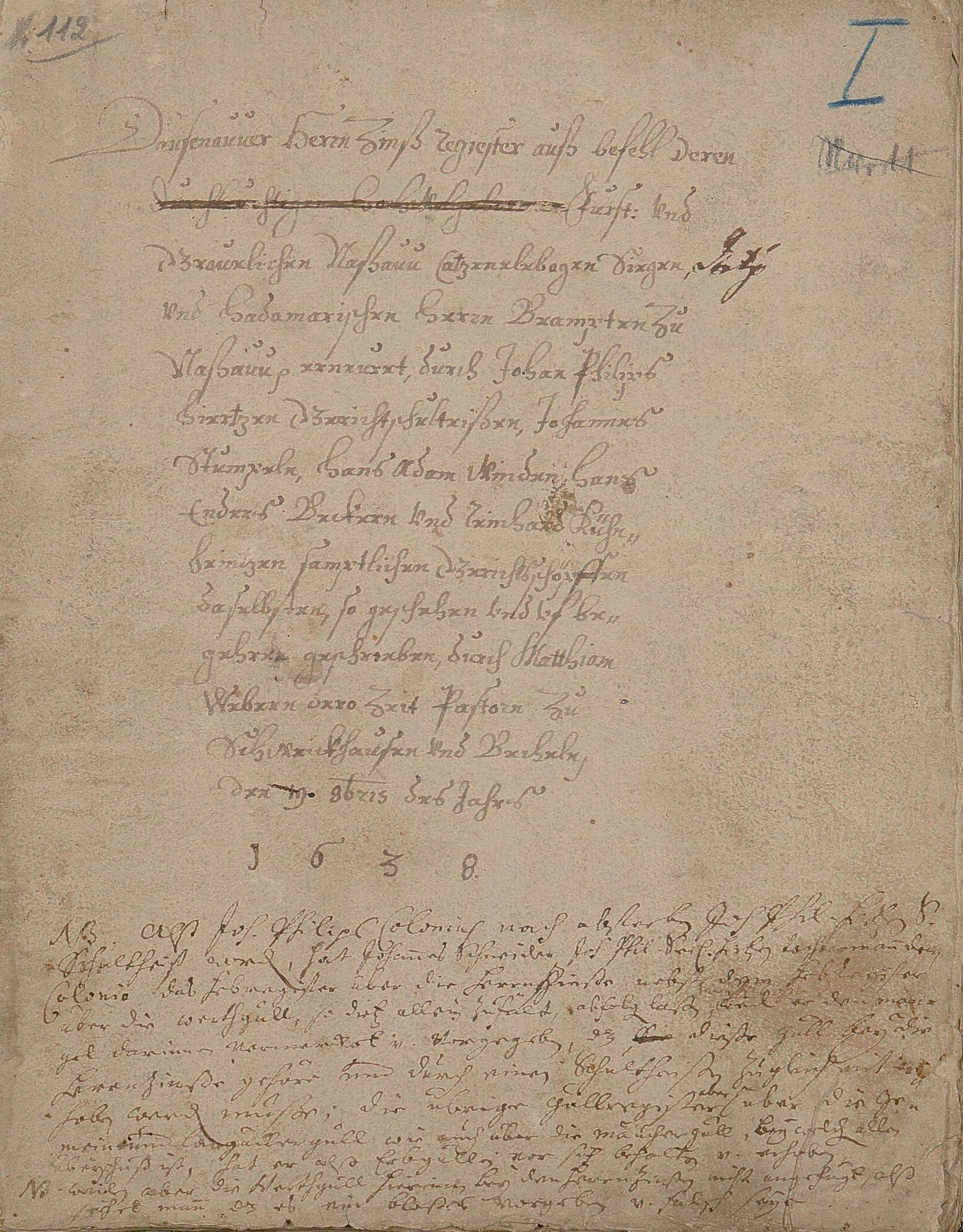 Herrenzinsregister (Zinsen, Unschlitt - Talg, Gänse, Wachs, Pfeffer und andere Abgaben)1638 erneuert durch den Gerichtsschultheiß Johann Philipp Hirtz und die Gerichtsschöffen Hans Endres Becker, Reinhard Kühnheinczen, Johann Stumpel und Hans Adam Winden - Schreiber der Pastor zu Schweighausen und Becheln Matthias Weber