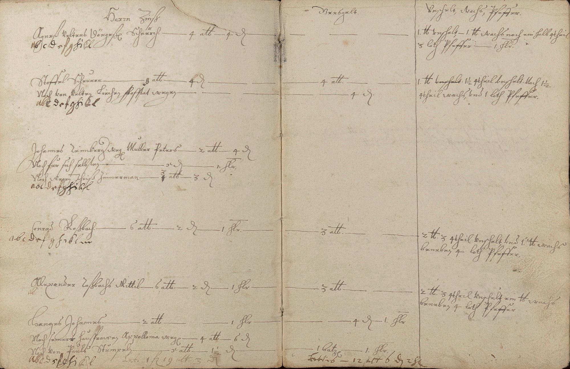 Herrenzinsregister (Zinsen, Unschlitt - Talg, Gänse, Wachs, Pfeffer und andere Abgaben)1638 erneuert durch den Gerichtsschultheiß Johann Philipp Hirtz und die Gerichtsschöffen Hans Endres Becker, Reinhard Kühnheinczen, Johann Stumpel und Hans Adam Winden - Schreiber der Pastor zu Schweighausen und Becheln Matthias Weber