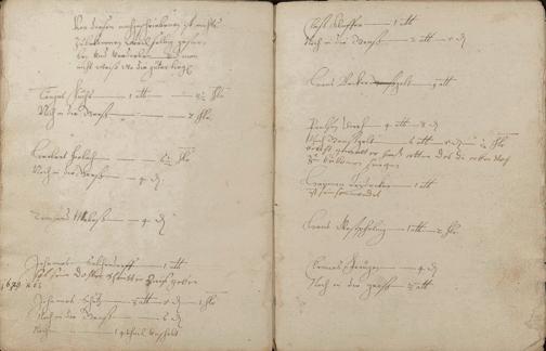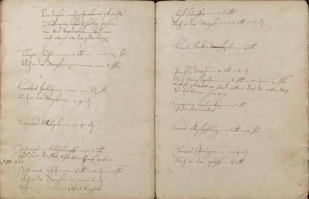 Herrenzinsregister (Zinsen, Unschlitt - Talg, Gänse, Wachs, Pfeffer und andere Abgaben)1638 erneuert durch den Gerichtsschultheiß Johann Philipp Hirtz und die Gerichtsschöffen Hans Endres Becker, Reinhard Kühnheinczen, Johann Stumpel und Hans Adam Winden - Schreiber der Pastor zu Schweighausen und Becheln Matthias Weber
