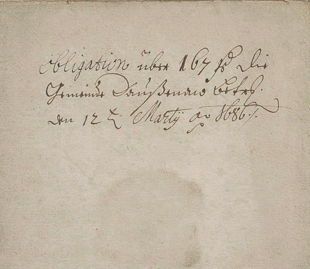 Die Gemeinde Dausenau bekennt Johann Nikolaus Hermann, Damstädtischem Vogt zu Ems, 167 Rtlr. zu schulden. 1693 März 8/12 erhöht das Amt Nassau die Schuld wegen rückständiger Zinsen auf 2oo Reichsthaler.Ems.....Siegel des Gerichts Dausenau: Unterschriften des Schultheißen und der Schöffen.