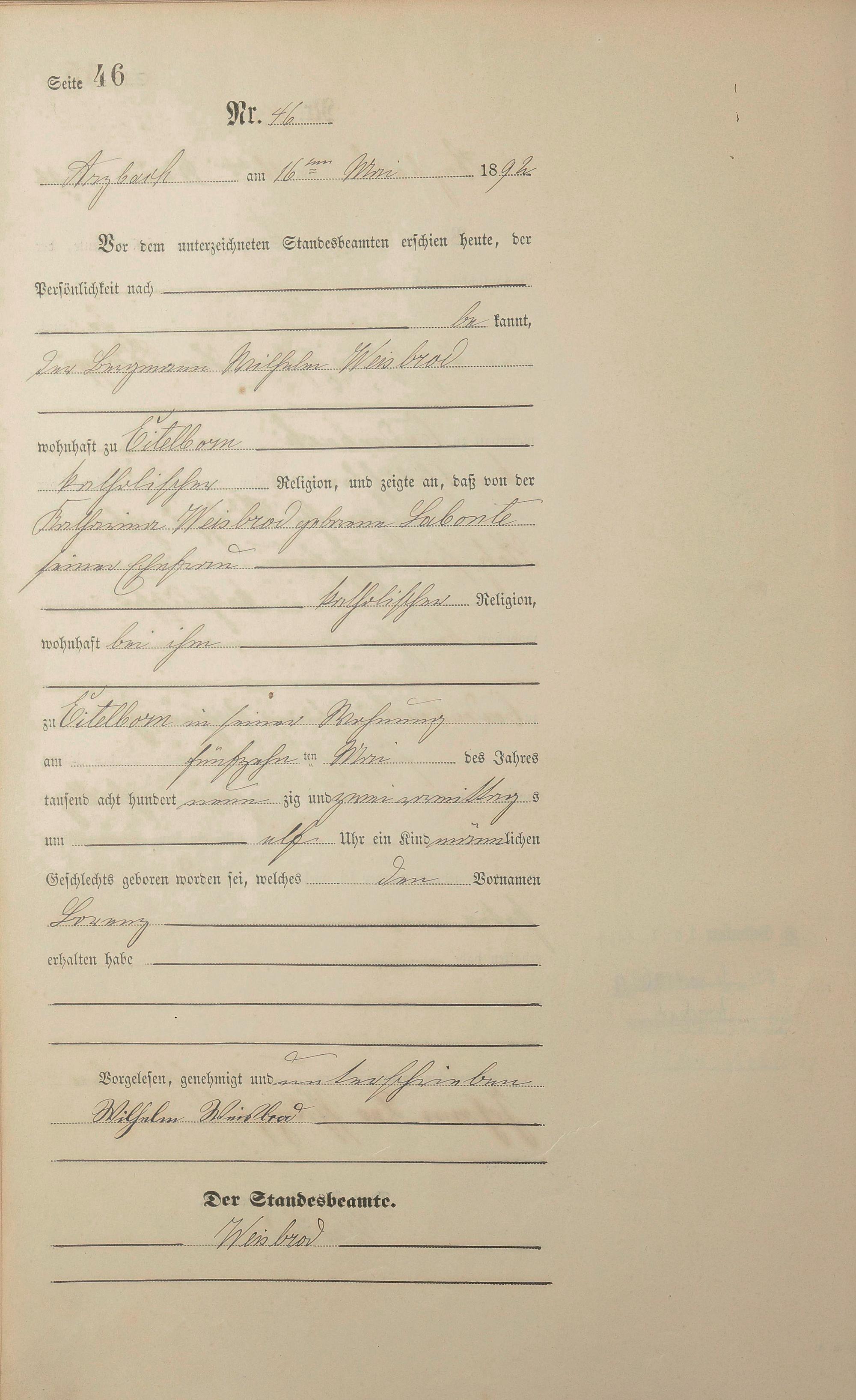 Geburtsregister 1892