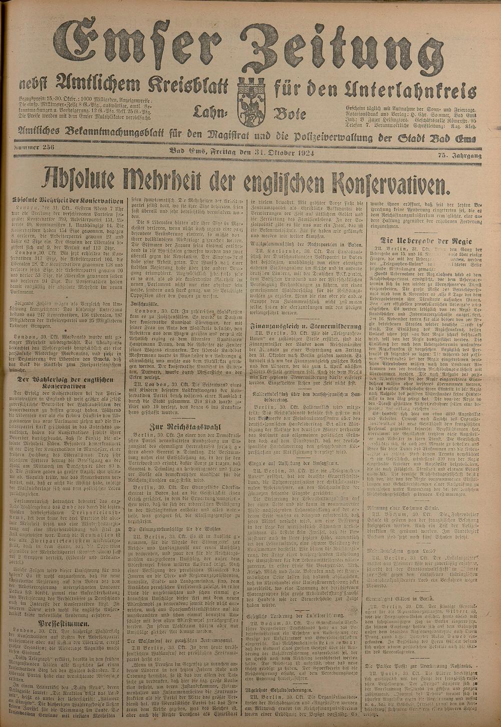 1924: Lahnbote bis 4. Apr. 1924/Emser Zeitung ab 5. Apr. 1924 - Nr. 10, 37 und 71...
