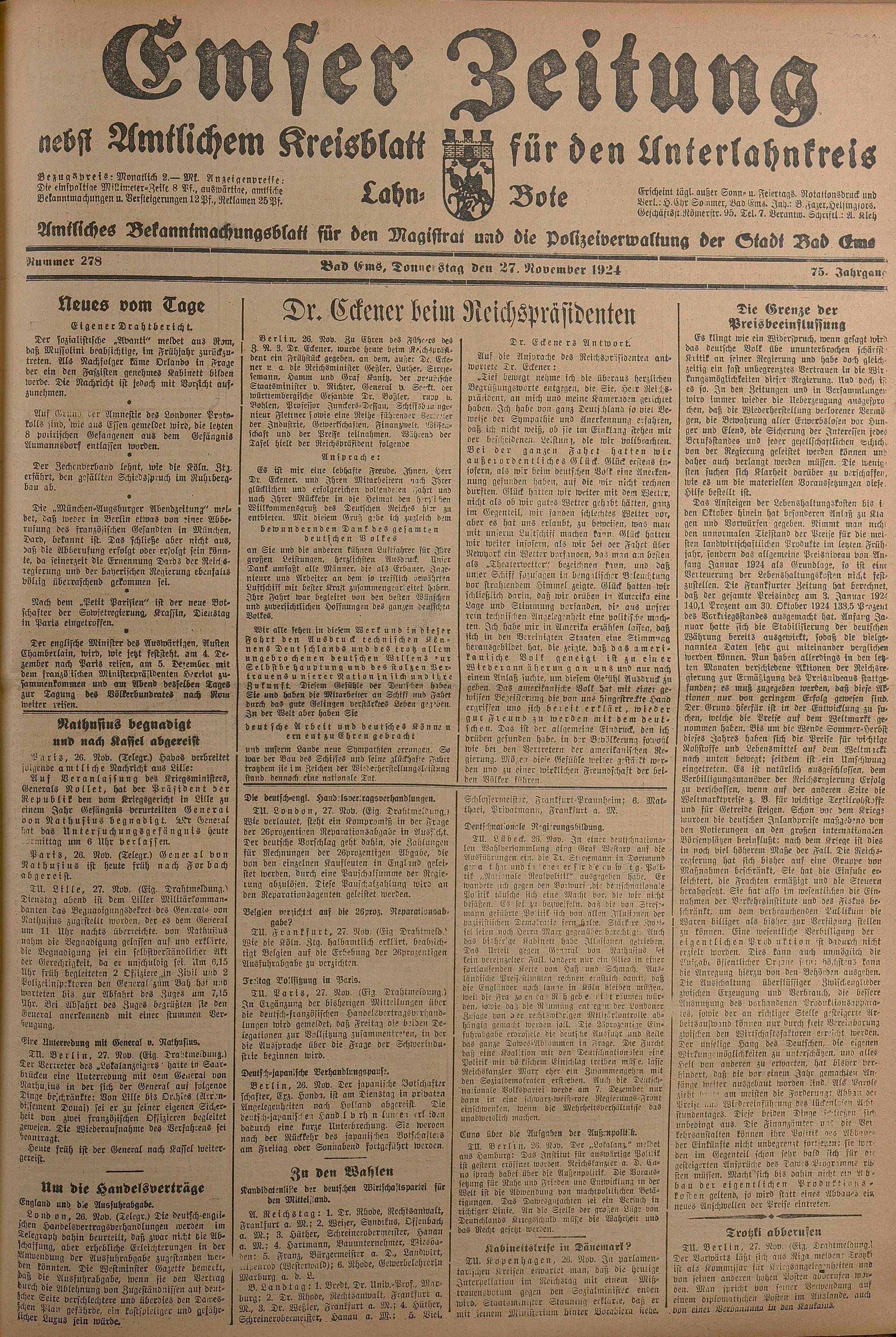 1924: Lahnbote bis 4. Apr. 1924/Emser Zeitung ab 5. Apr. 1924 - Nr. 10, 37 und 71...