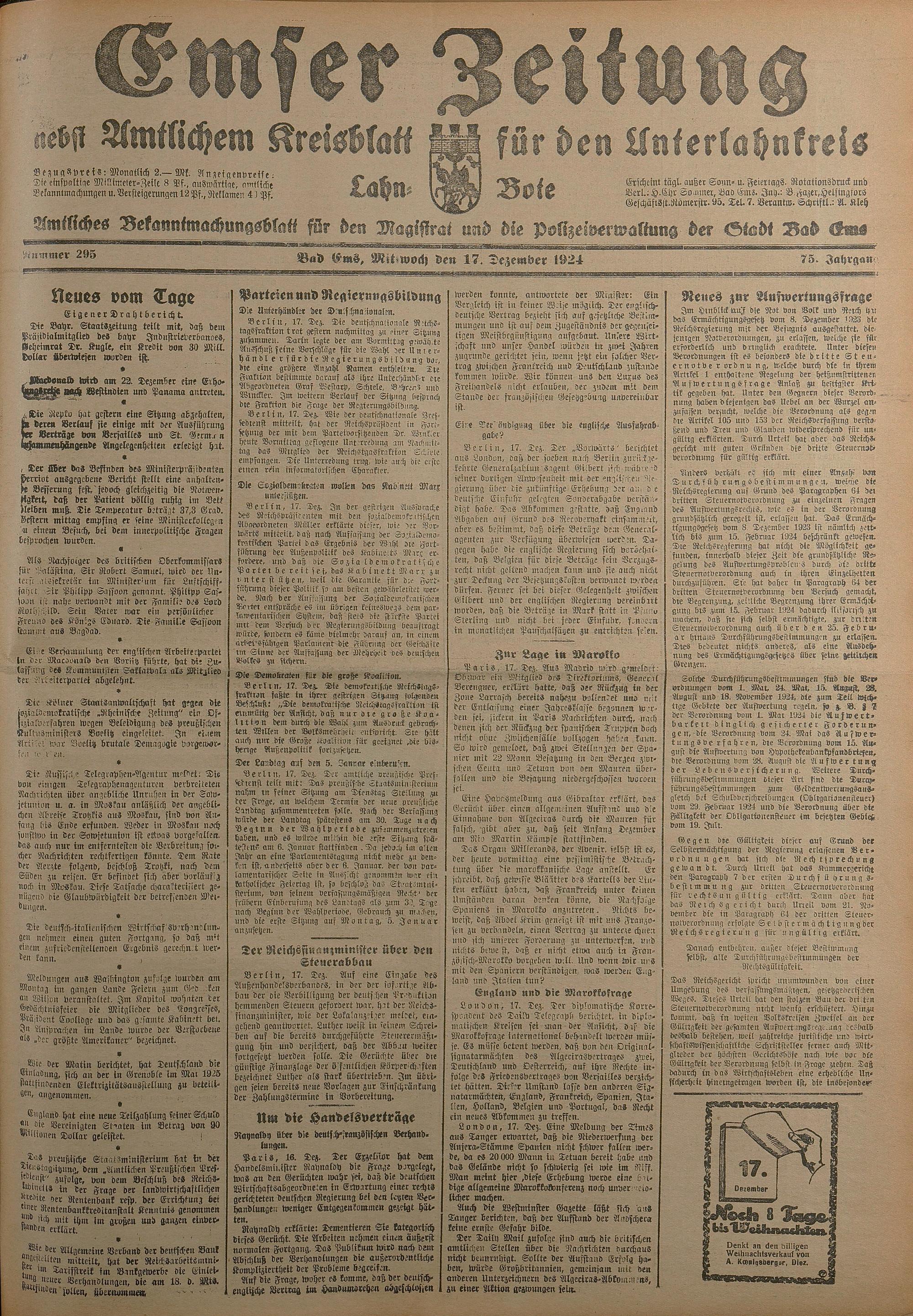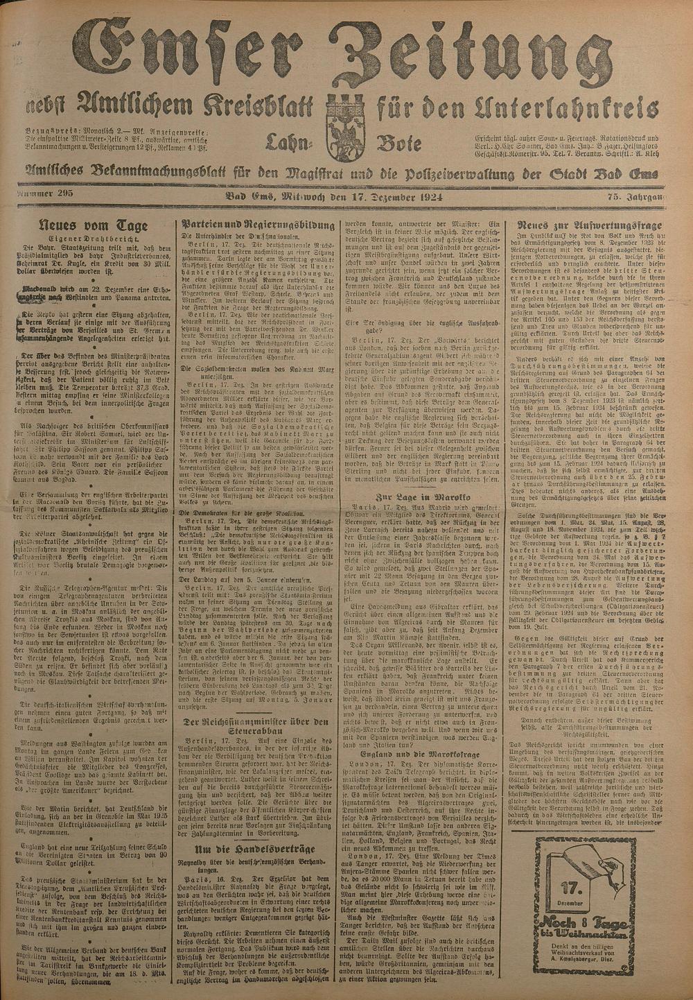 1924: Lahnbote bis 4. Apr. 1924/Emser Zeitung ab 5. Apr. 1924 - Nr. 10, 37 und 71...