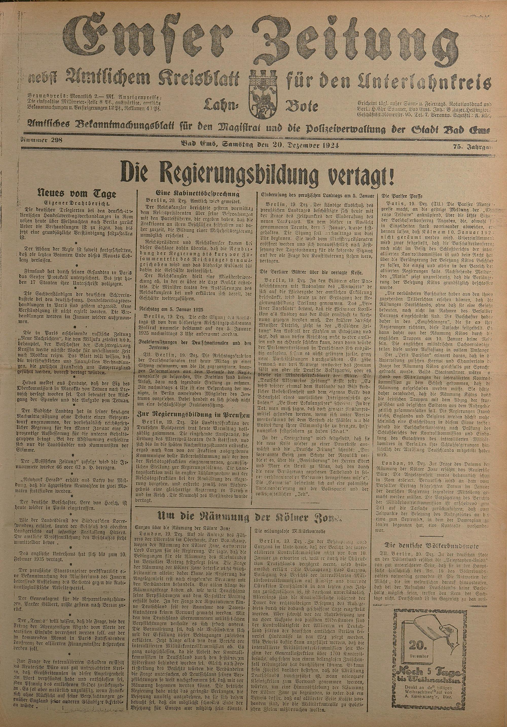 1924: Lahnbote bis 4. Apr. 1924/Emser Zeitung ab 5. Apr. 1924 - Nr. 10, 37 und 71...