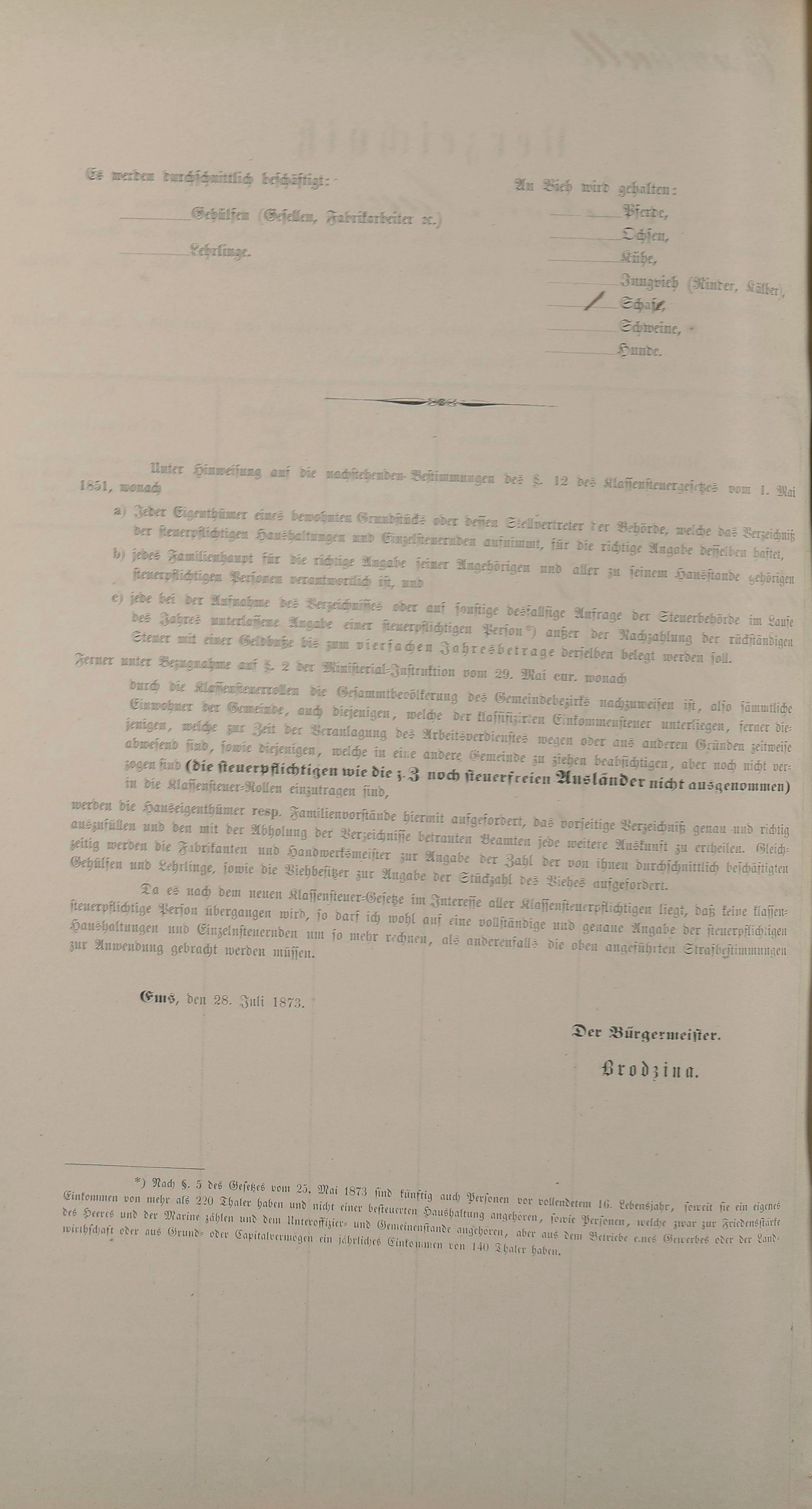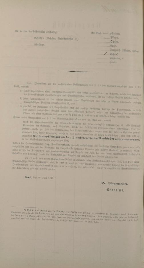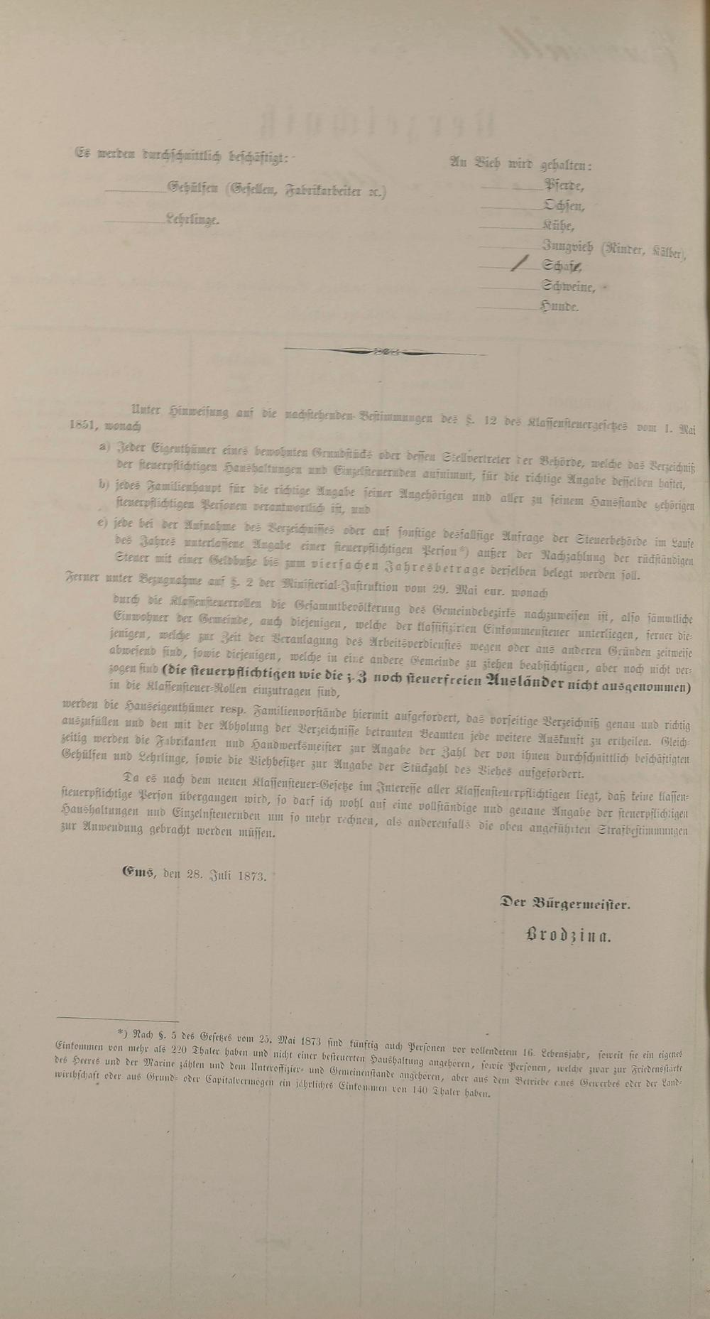 Personenstandsaufnahme zur Klassensteuerrolle für 1873