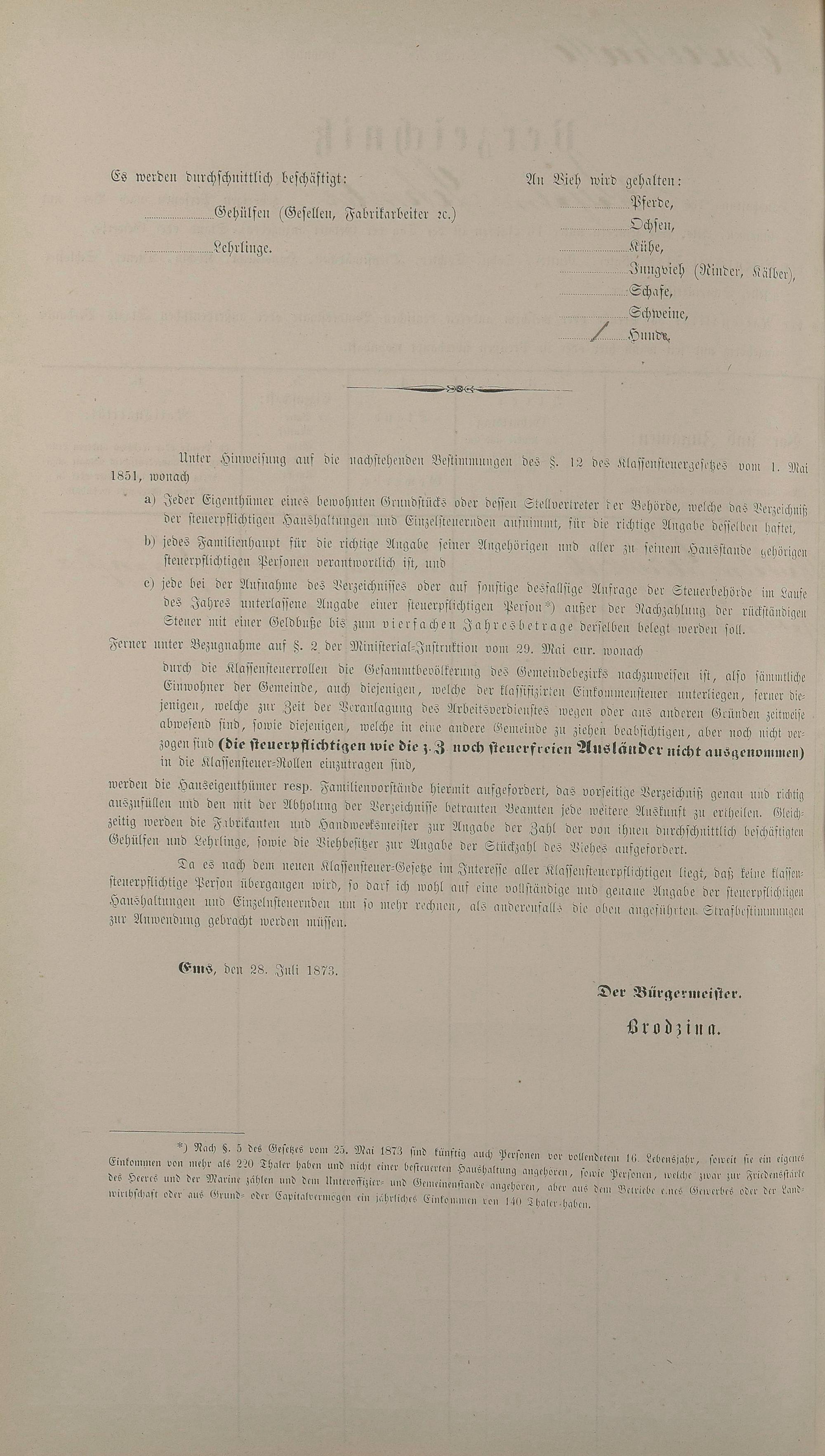 Personenstandsaufnahme zur Klassensteuerrolle für 1873