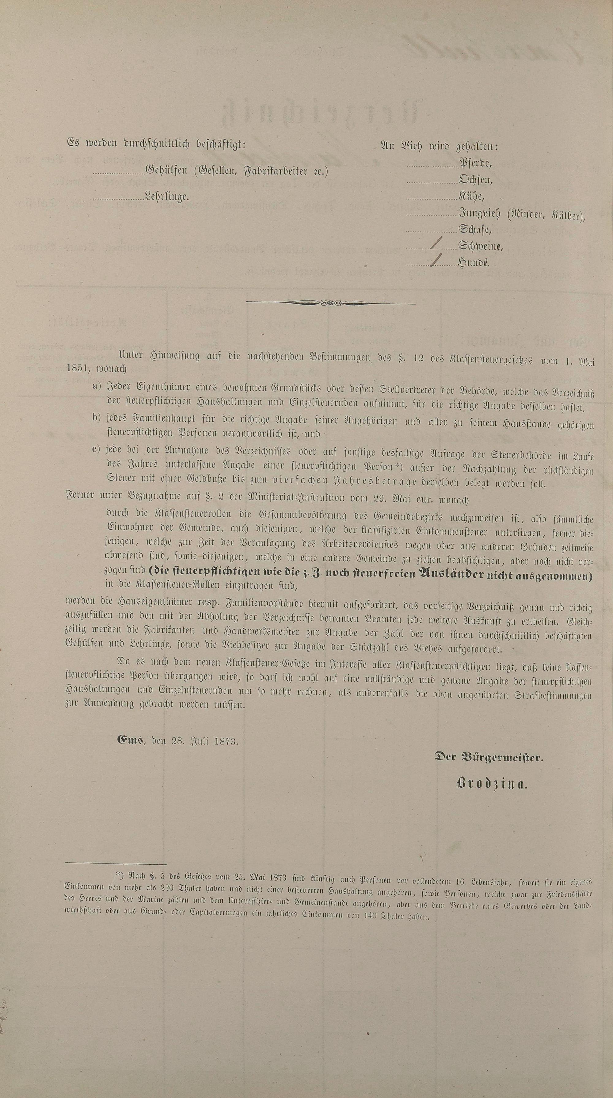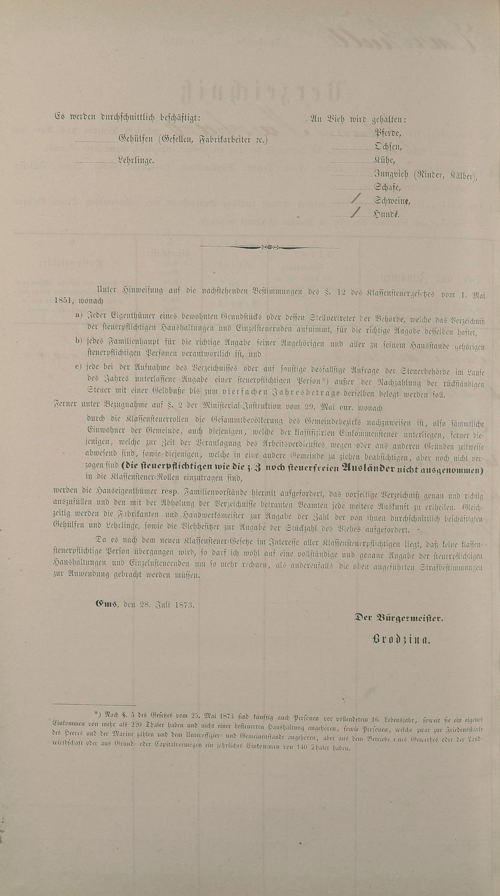 Personenstandsaufnahme zur Klassensteuerrolle für 1873