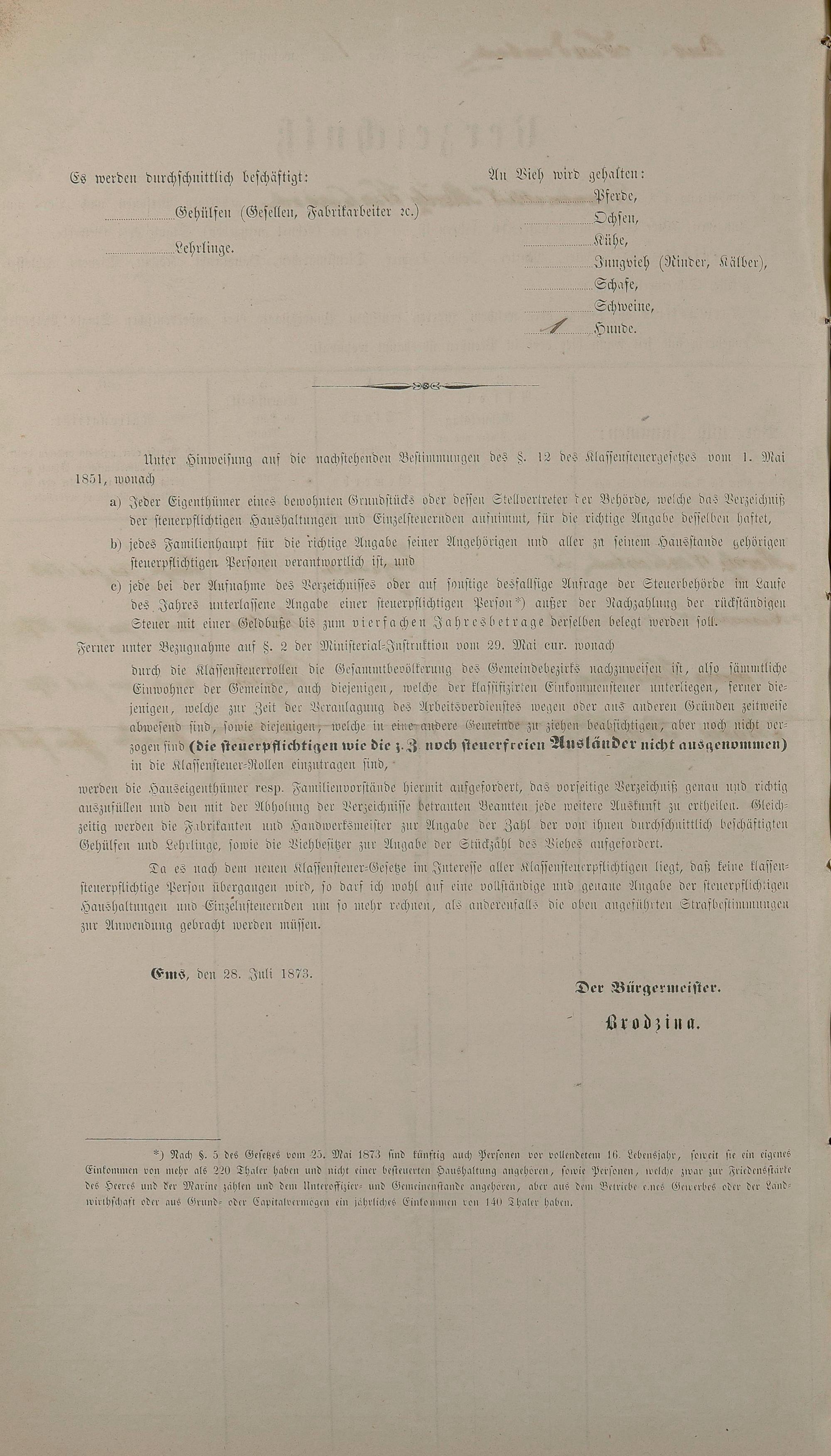 Personenstandsaufnahme zur Klassensteuerrolle für 1873