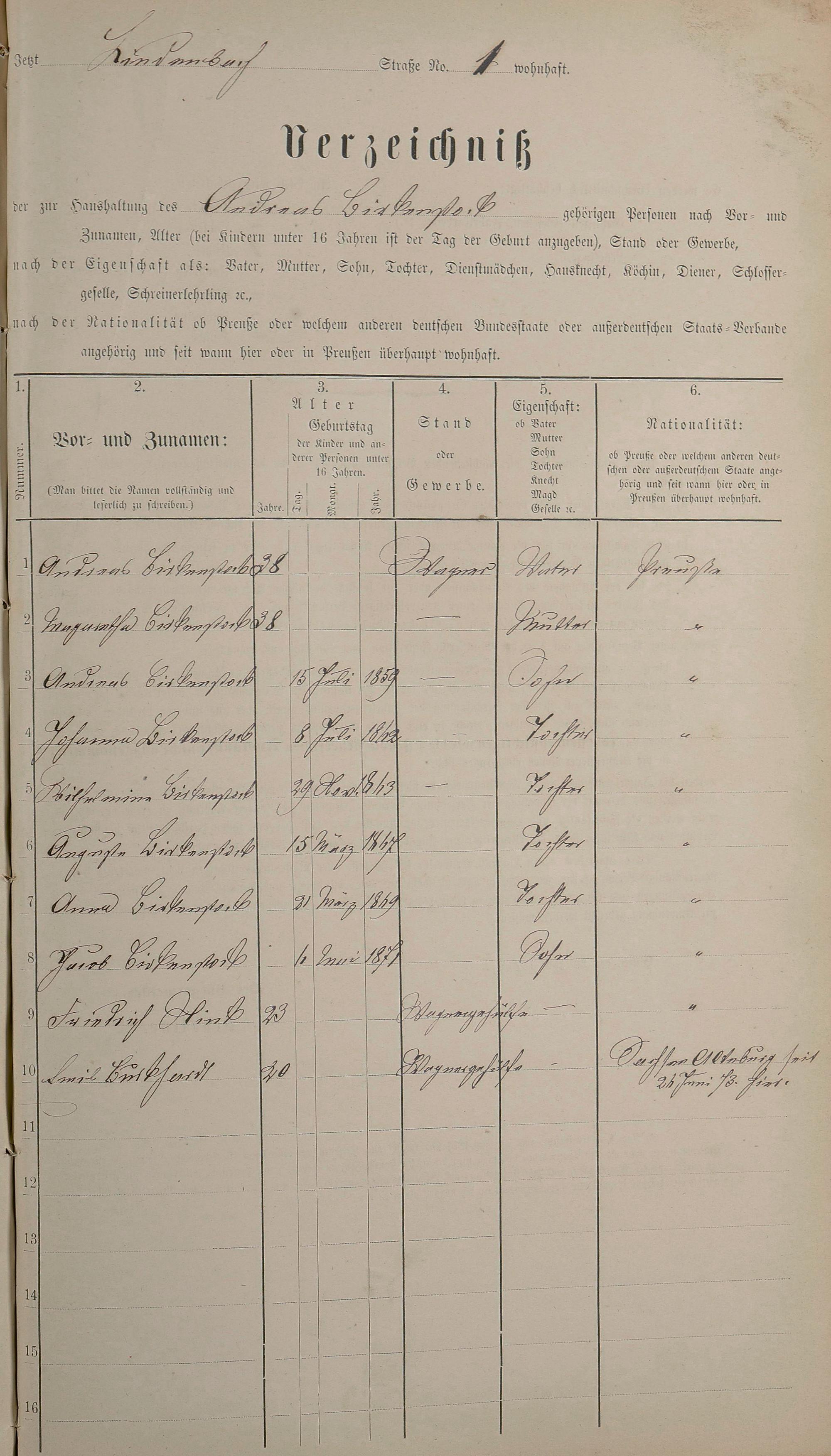 Personenstandsaufnahme zur Klassensteuerrolle für 1873