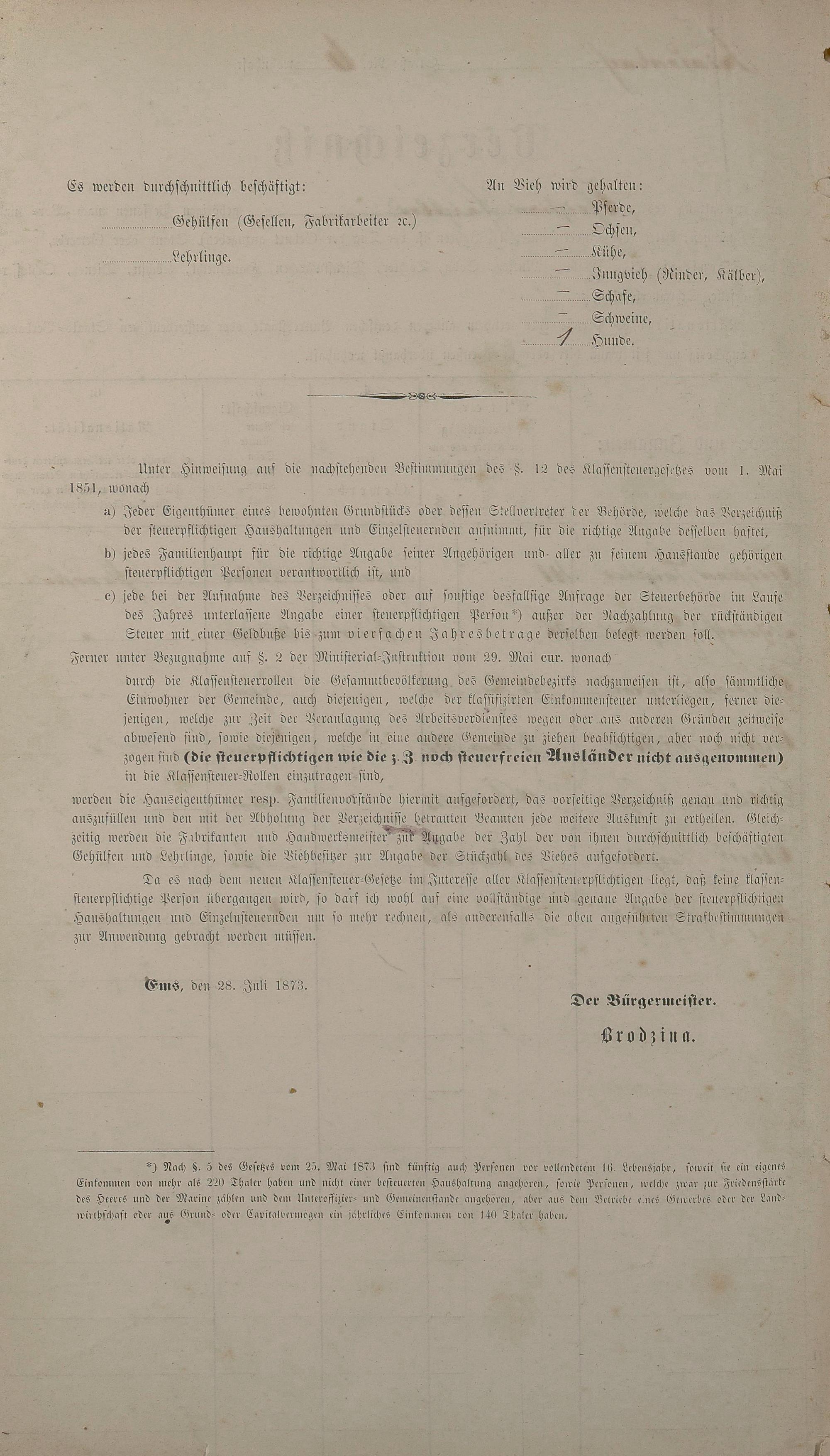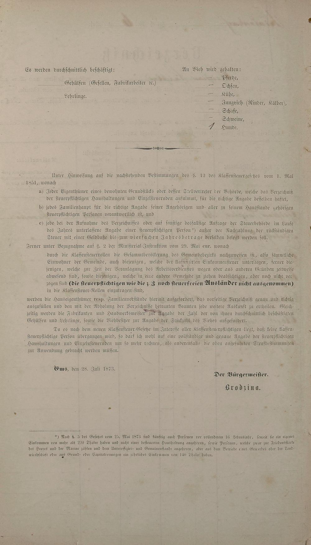 Personenstandsaufnahme zur Klassensteuerrolle für 1873