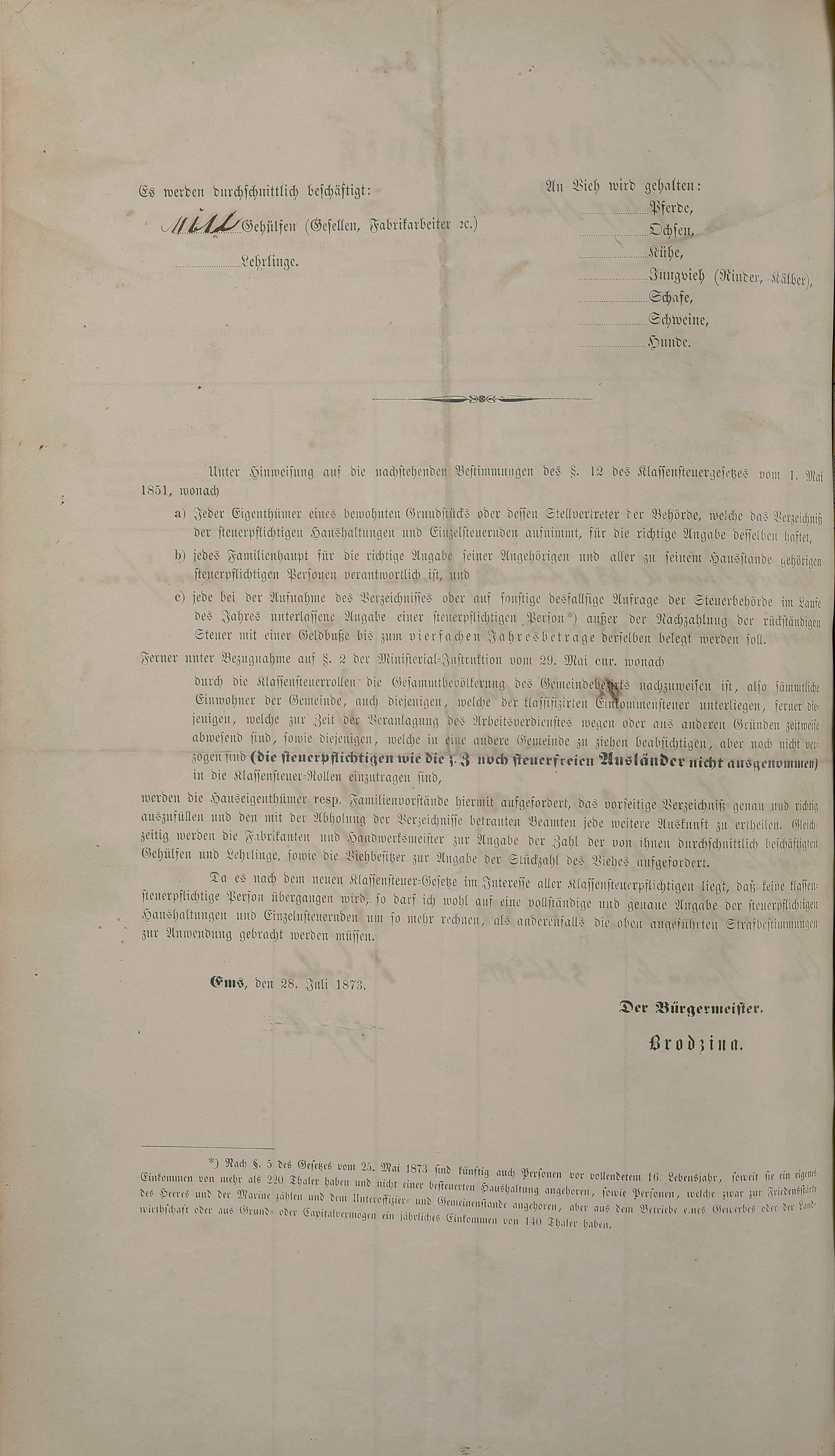 Personenstandsaufnahme zur Klassensteuerrolle für 1873