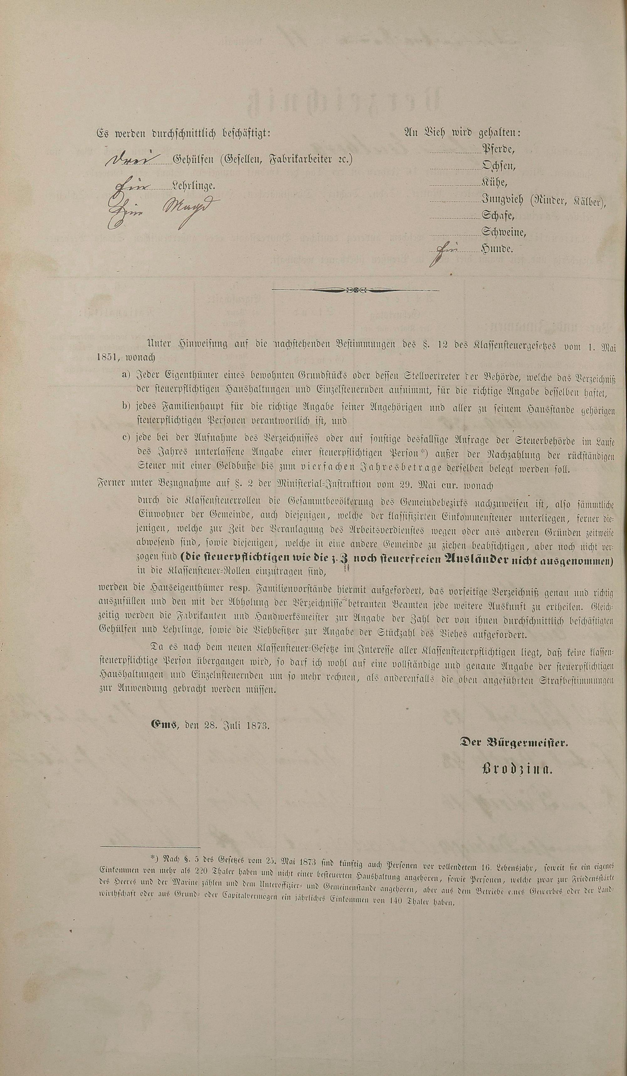 Personenstandsaufnahme zur Klassensteuerrolle für 1873