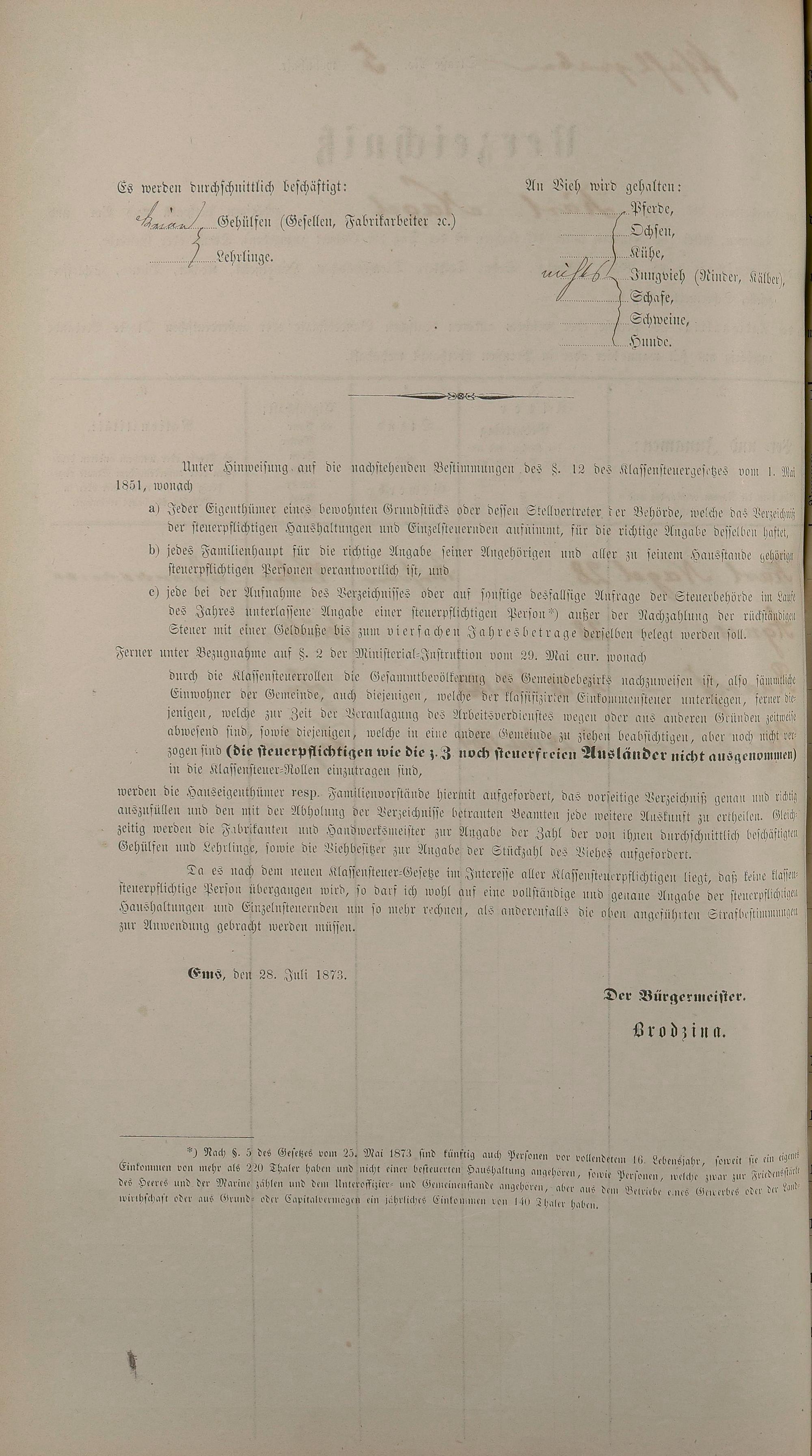 Personenstandsaufnahme zur Klassensteuerrolle für 1873