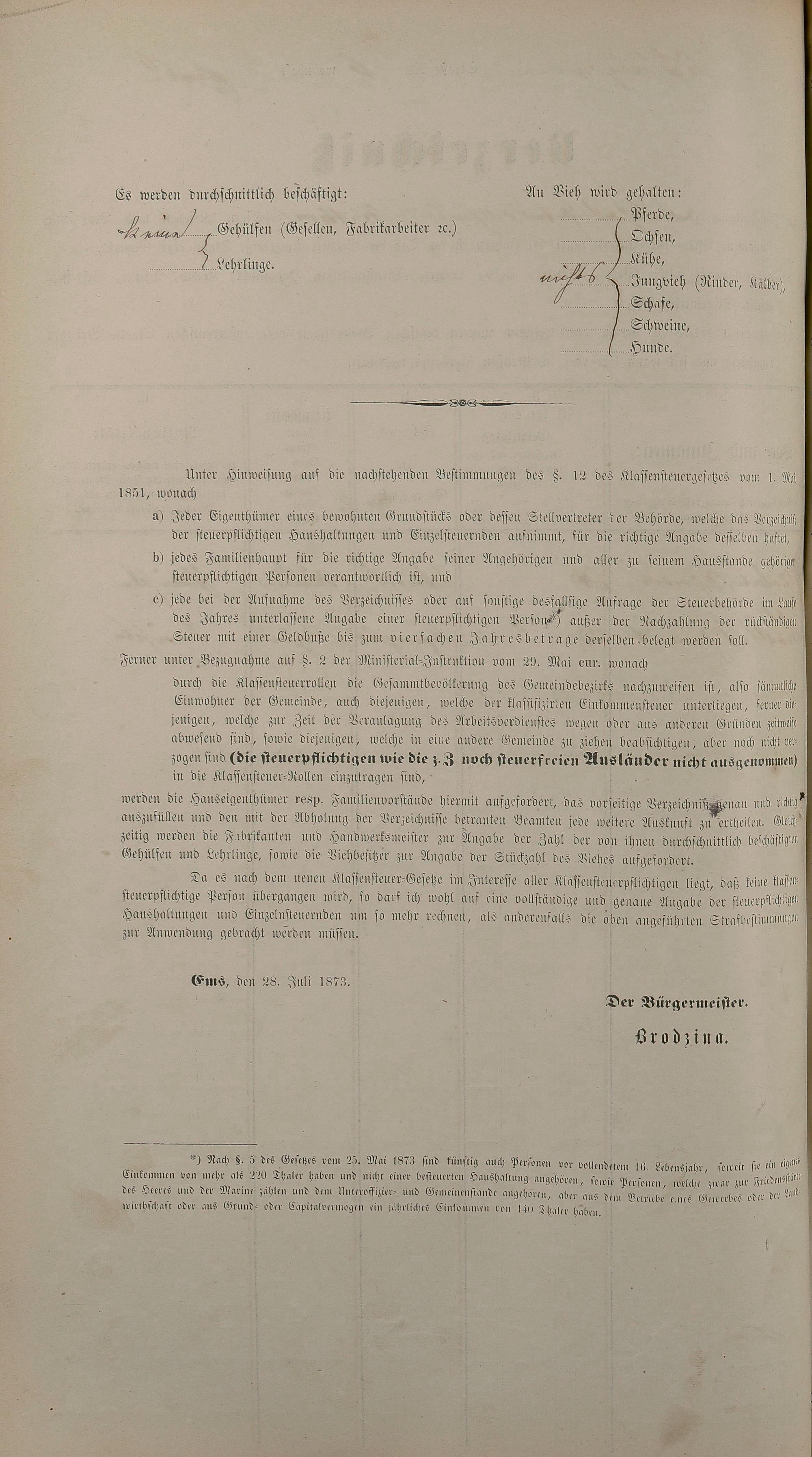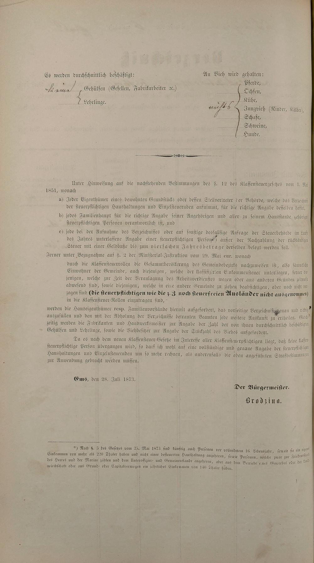 Personenstandsaufnahme zur Klassensteuerrolle für 1873